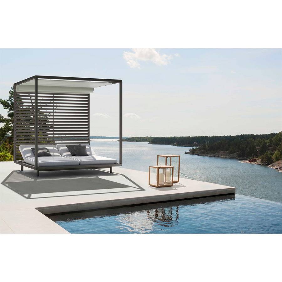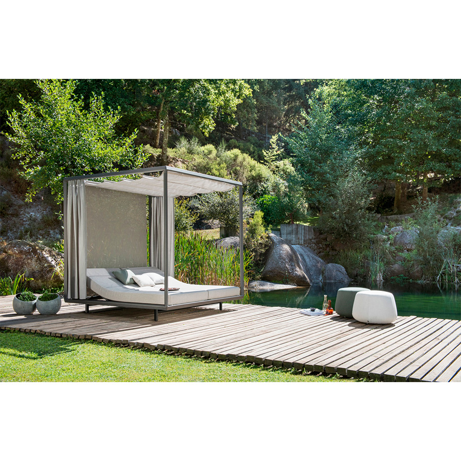 Monica Armani modernizes the classic four-poster bed, illuminating a geometric silhouette in powder-coated aluminum. In addition, the sofa bed can be fully configured to your liking. So, for example, you can choose the back panel and cover in aluminum or teak wood slats or in Sunvision sliding fabric, a type of patented fabric that filters the sun's rays without blocking light.