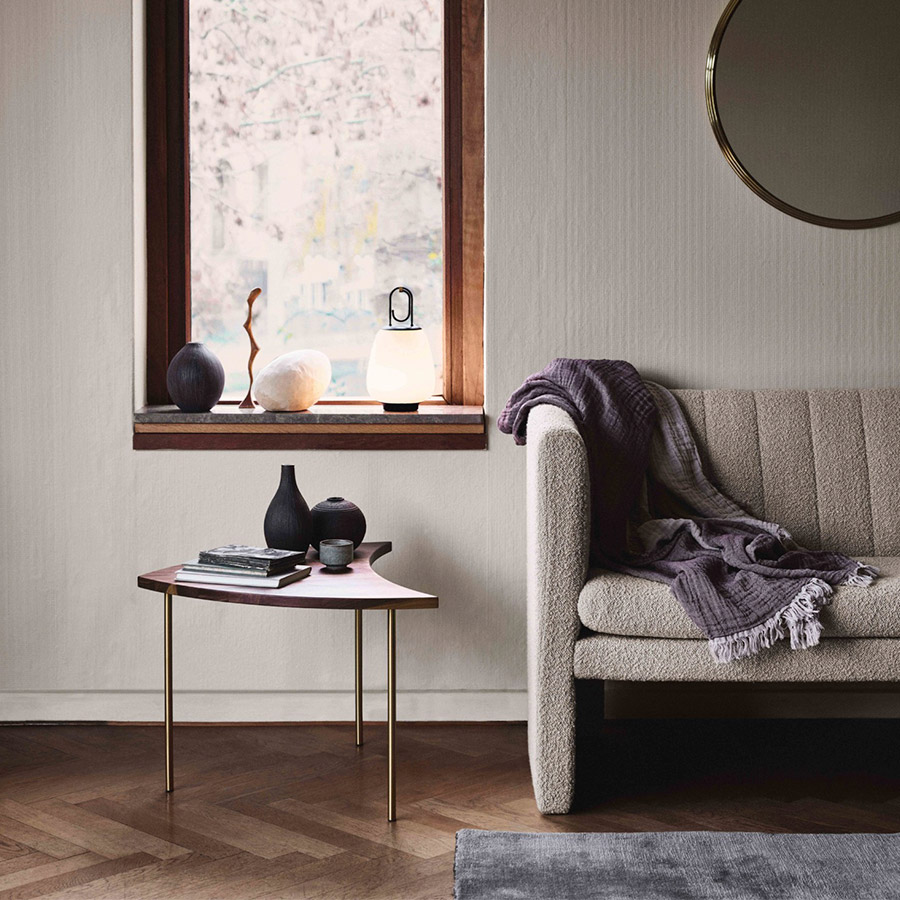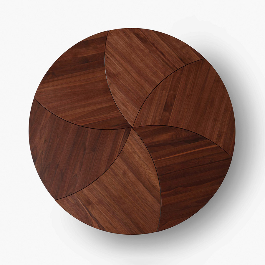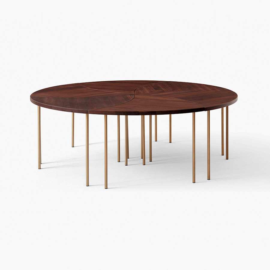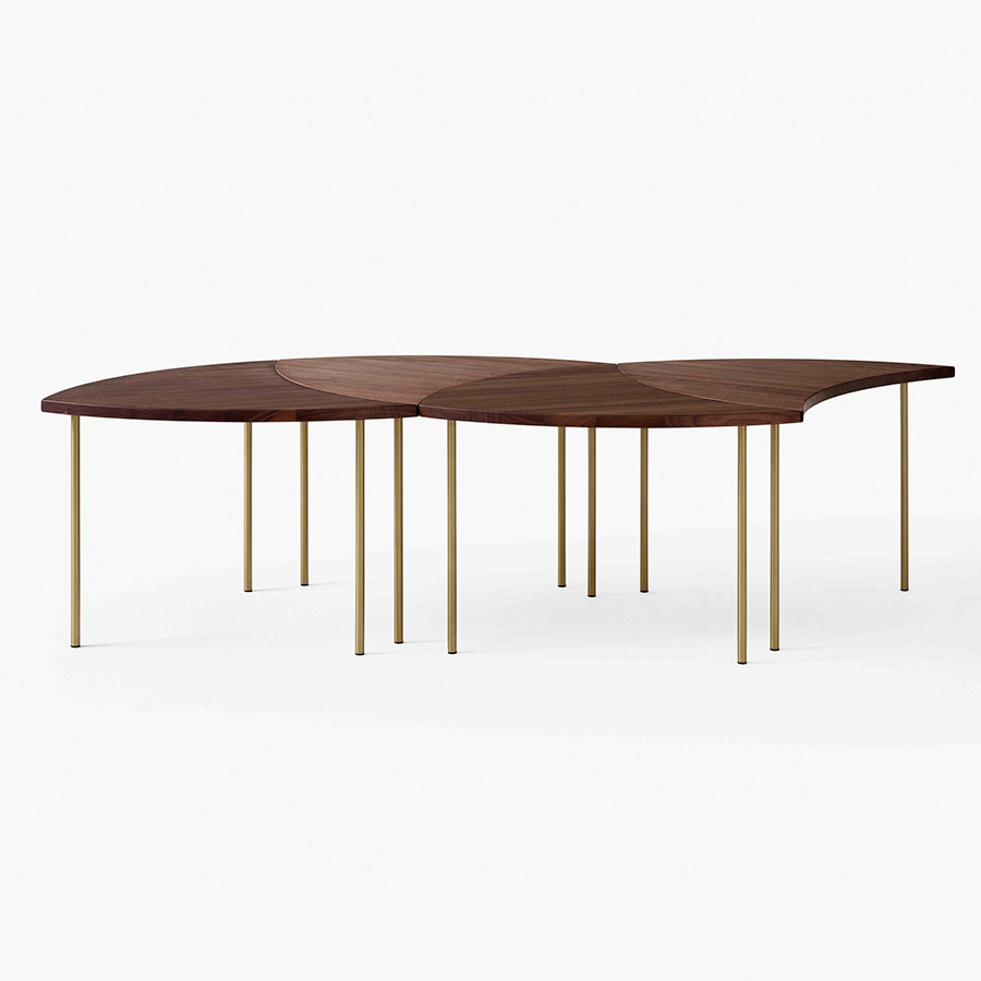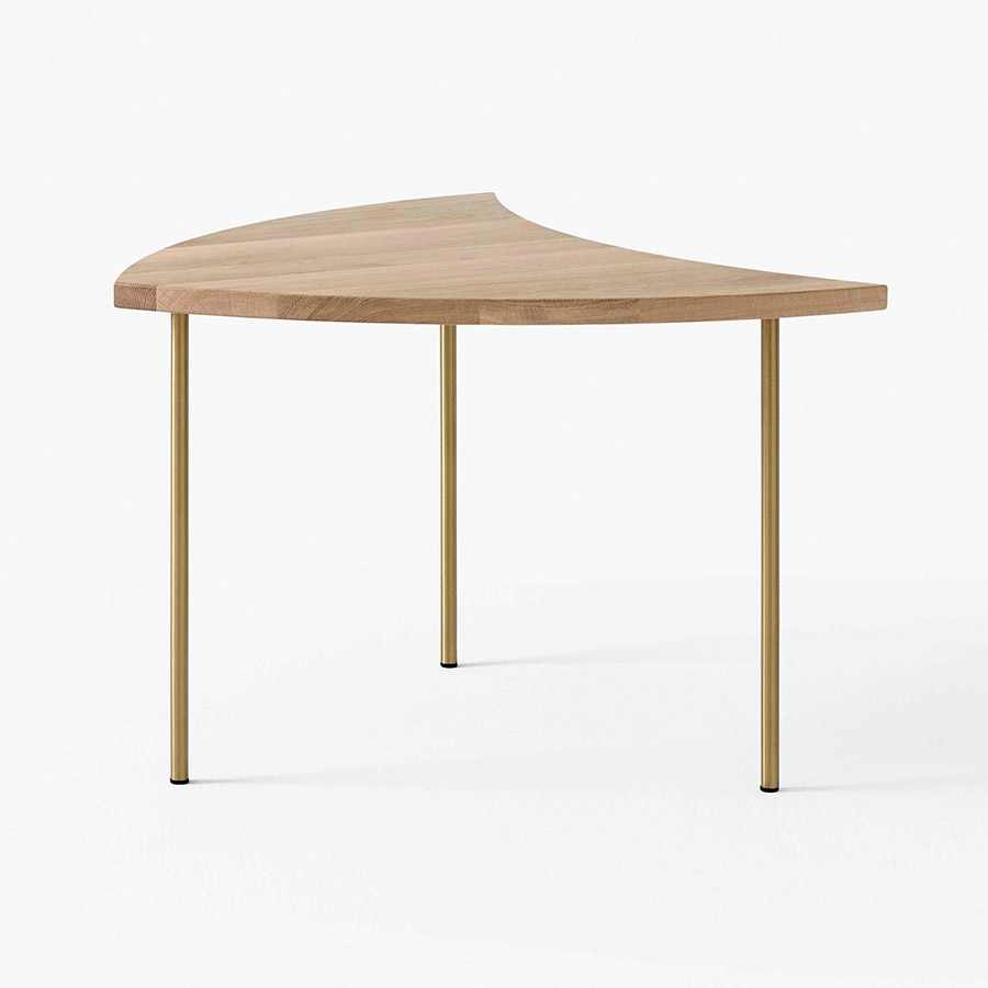 Designed by Hvidt & Molgaard, the Pinwheel Modular Table is a versatile piece that works individually or together. First produced in 1953, the elegant table is inspired by the playful, geometric design of a pinwheel toy. It is a versatile piece that can be grouped together to form a larger table, becoming a round coffee table or an elongated and rectangular one. The table is available in natural oak or walnut, and the legs are brass.