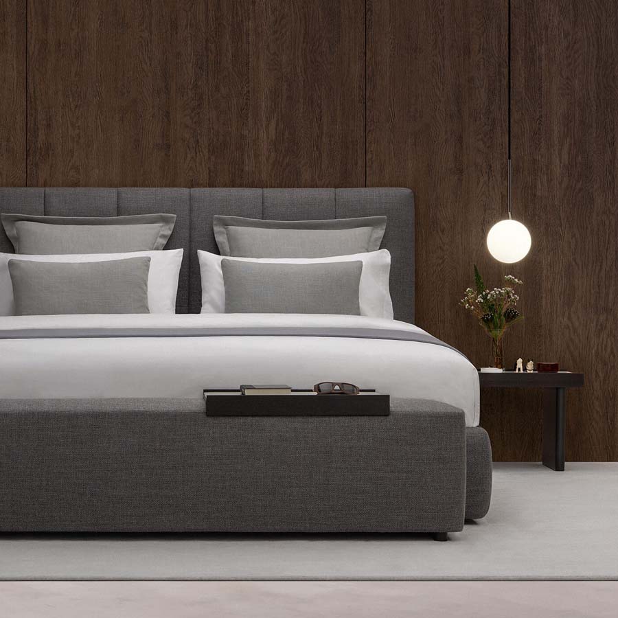 Mario RuizThe clarity and balance of proportions give Pulse a distinctive character that celebrates comfort and quiet sophistication. With a tall headboard and ultra-thick and comfortable volumetry, available as a standalone piece as well, the bed can have a suspended base on visible legs, upholstered to the floor, or with storage.