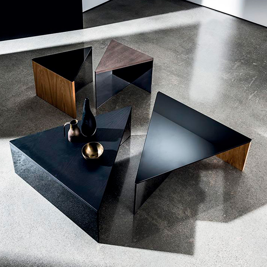 Alberto Lievore Jeannette Altherr Manel MolinaRegolo is a modern triangular coffee table available with its top in black laminated glass or wood, various finishes.