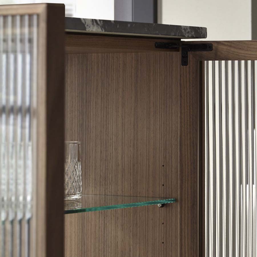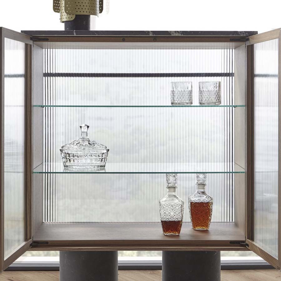 The cabinet’s interior and exterior are of MDF fiberboards with walnut wood veneer. Each module includes an internal tempered glass shelf fixed in the middle, with a matt Marquina Marble top and totems, walnut solid wood doors and wavy tempered glass. Features totem feet with integrated adjustable mechanisms and hinged doors without handles with 105-degree opening with hidden hinges. Fully assembled.