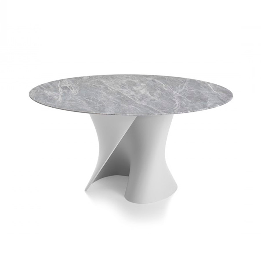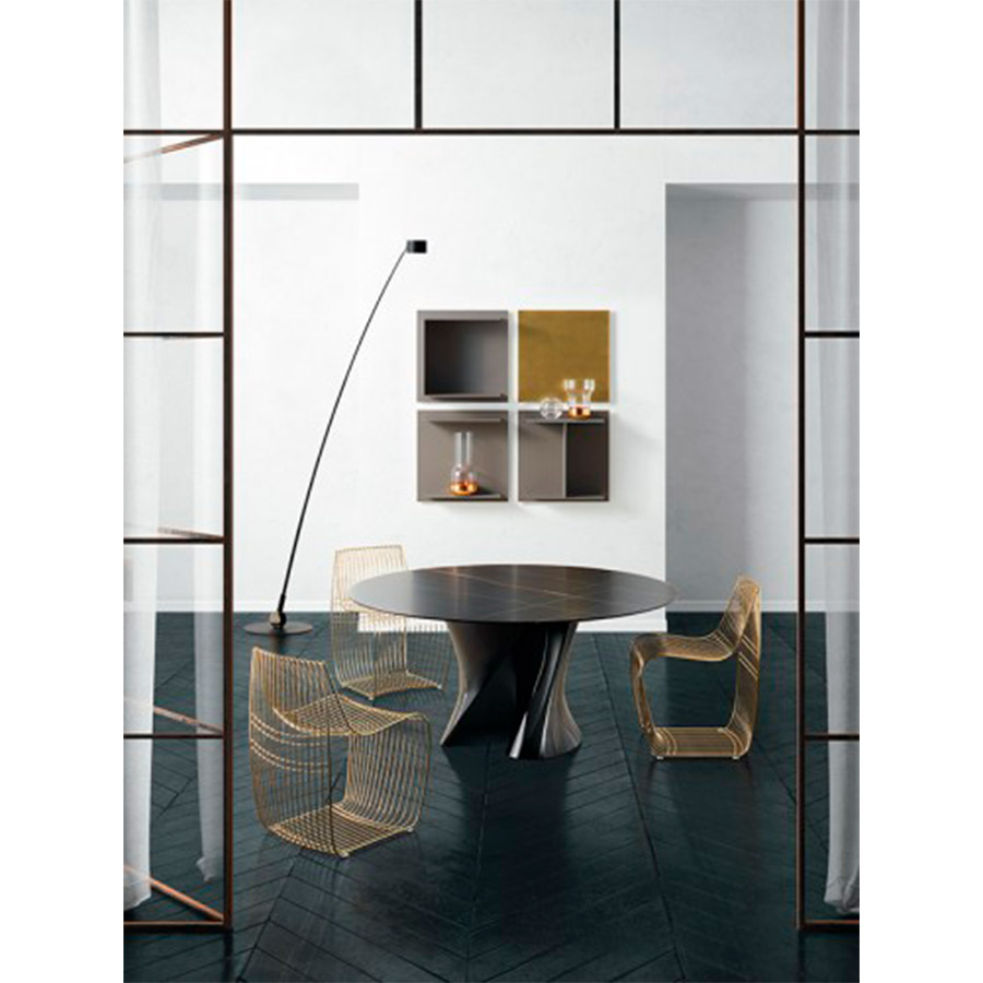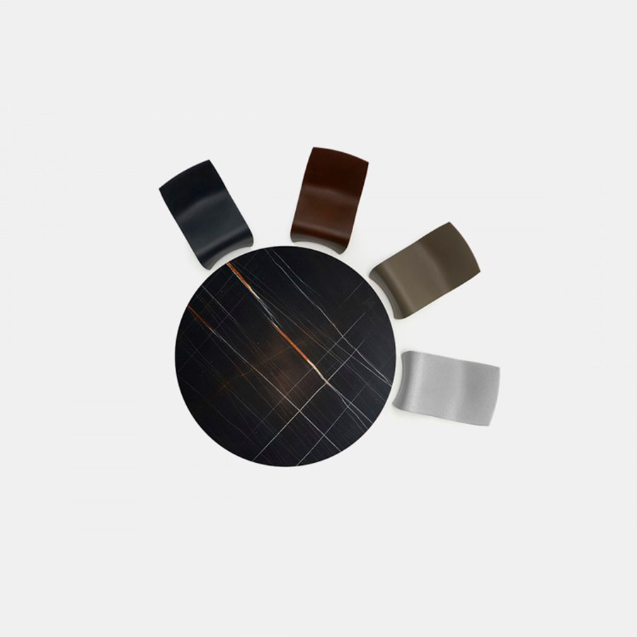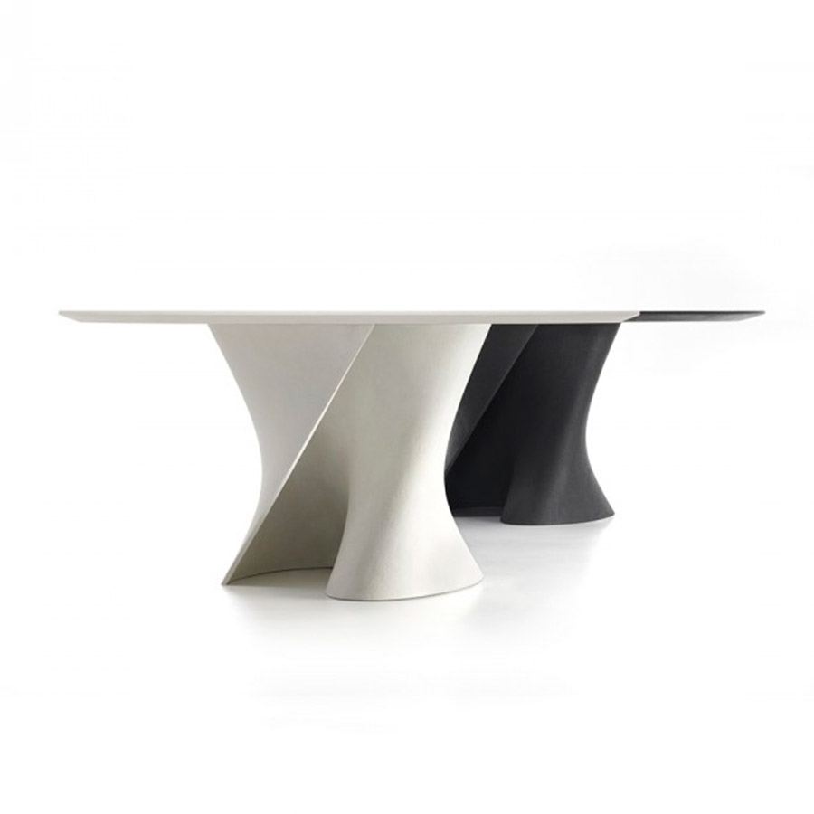 The award-winning designer’s creations truly stand out for the visible tension he gives to his objects, featuring curves inspired by the process of (de)forming metal surfaces that identify his entire creative journey. The support, molded in Ceramilux or Cristalplant, a technologically advanced, hypoallergenic, and non-toxic material, can be crowned with different types of top – in glass, wood fiber, marble, or Cristalplant – to further personalize an already unique object.