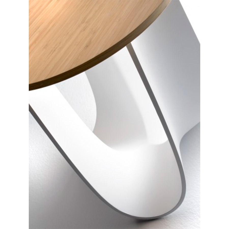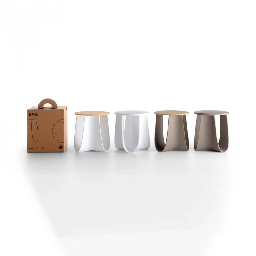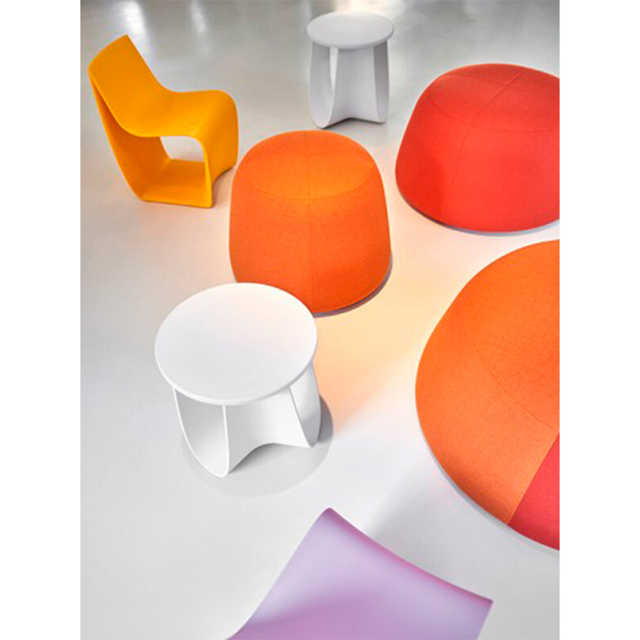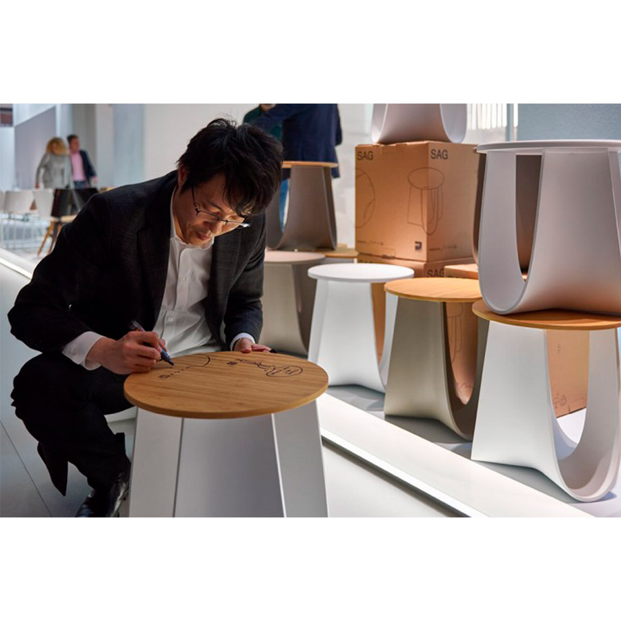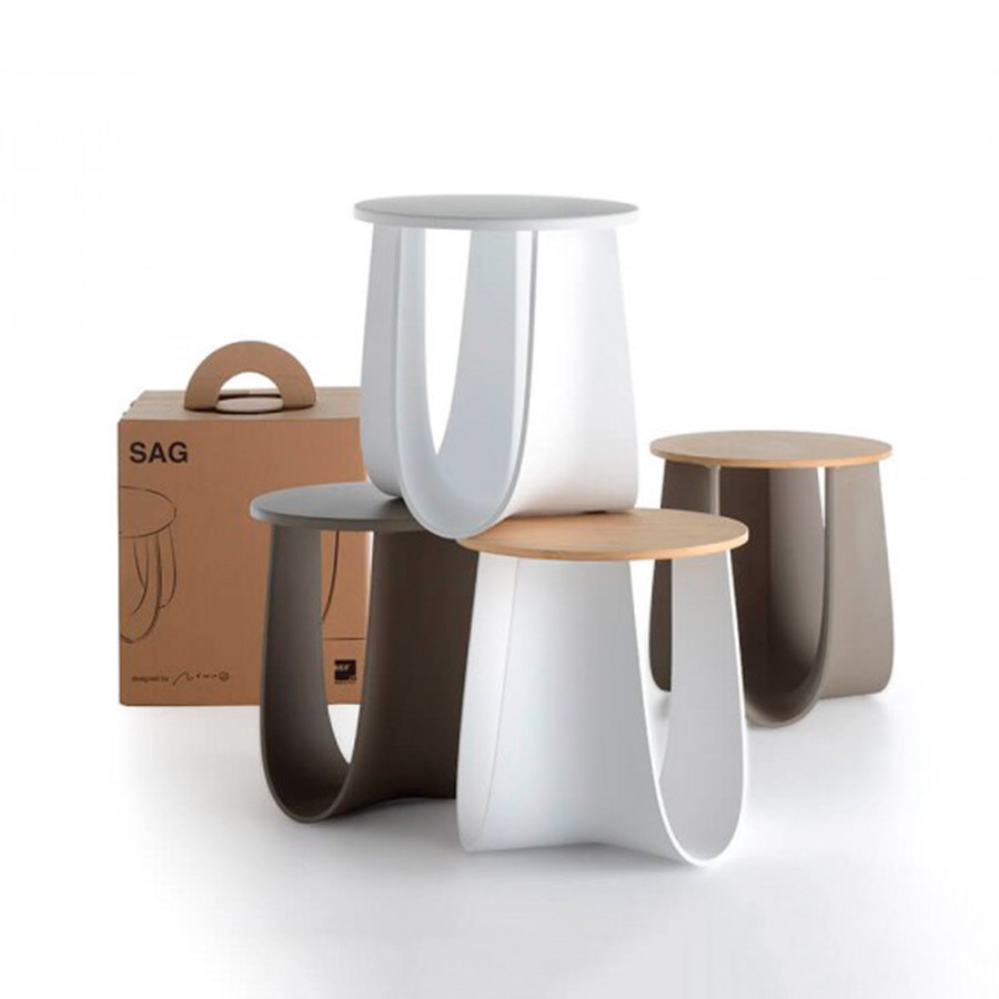 Nendo Oki SatoStool or table, outdoors or indoors: Sag represents a polyhedral and functional complement. Stool legs are usually designed with “column” elements. On the contrary, Sag has been designed as a whole piece folded in on itself, like a fabric suspended in the air and fused into a single shape in three directions. Its concave arch structure, generated in this way, gives Sag its unique soft and elastic image and incredible robustness, capable of distributing forces and absorbing loads. Rigid polyurethane structure, obtained by molding, available in matt white and matt mud.