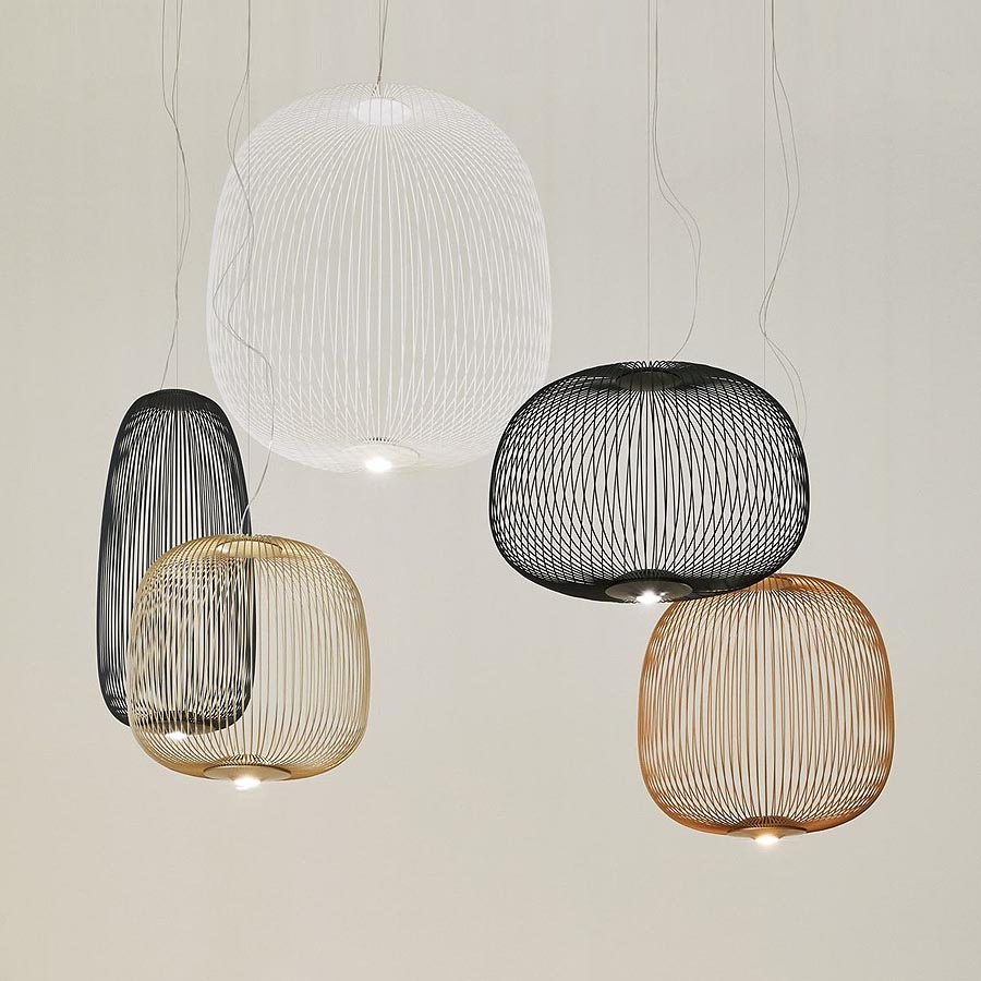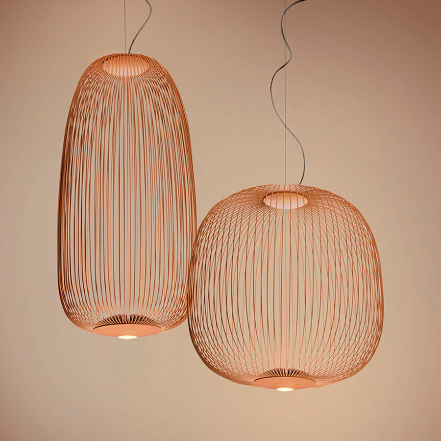 Collection of suspension lamps in two different shapes. The suspension lamp is inspired by suggestions derived from ancient oriental lanterns to most domestic birdhouses. The realization stems from observing the spokes of a bicycle wheel, from which the project also takes its name: Spokes, which in English means precisely spokes. The result is a lamp with a soft shape and a light volume that contains the light, letting it filter into the space.