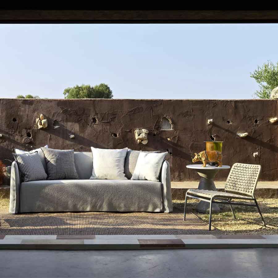 Simple and refined, the Straw 25 lounge chair is characterized by its light gray painted tubular aluminum frame. This lightweight product is covered with a framework made by hand with double-twisted polyethylene rope, a fiber with a natural appearance, robust, flexible, and durable, specifically designed for outdoors.