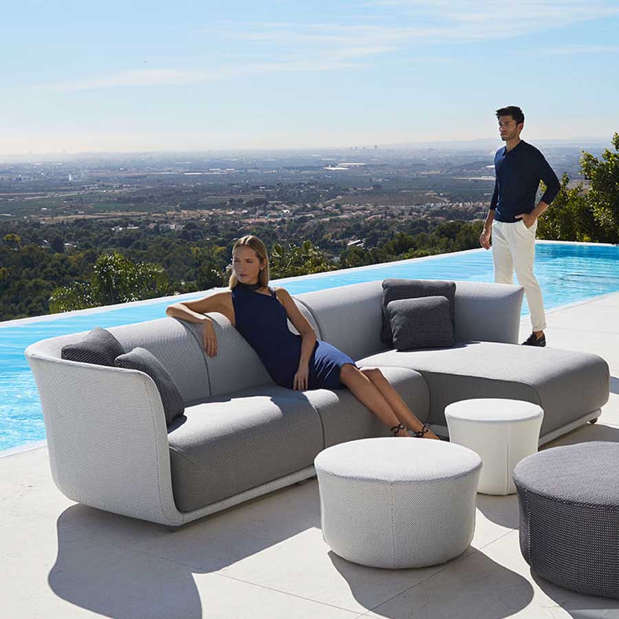 Modular sofa made with flexible polyurethane foam. Fully upholstered, with solutions and materials designed for outdoor use, yet with the warmth and comfort of indoor fabric. Available in a wide range of fabric colors that offer the possibility of creating completely unique and personal spaces. To enjoy comfort in any setting. Suitable for both outdoor and indoor use.