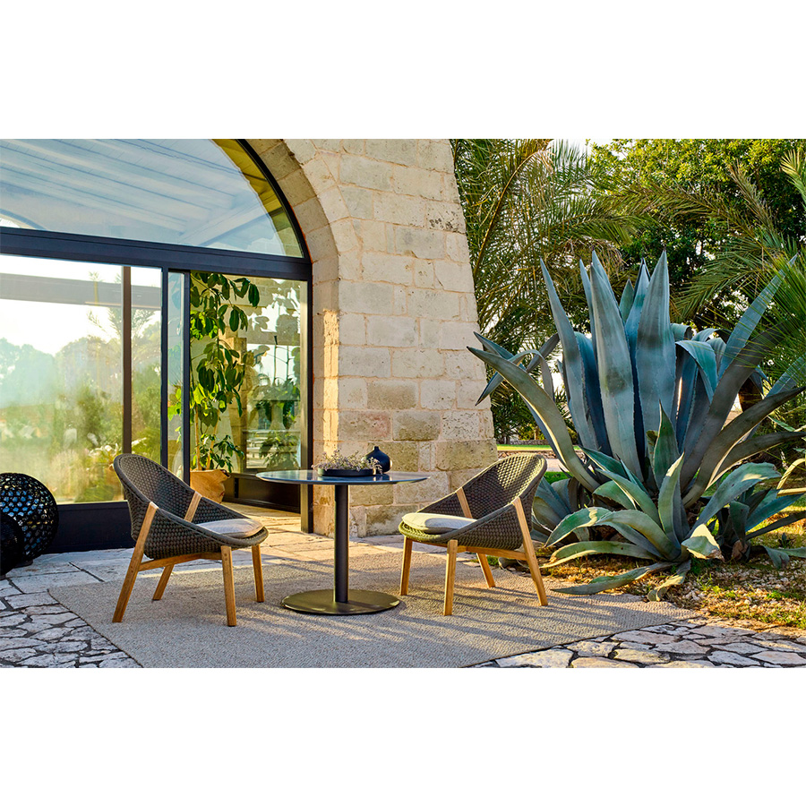 Marc Merckx Pieter MaesThe elegant T-Table, with refined proportions and elegant materials, makes it possible to dream of a glamorous Dolce Vita. The tabletop, made of glazed lava stone, reflects the sky and refers to a gently rippling water surface. No board is the same because of the natural imperfections of the lava stone, which shows a subtle crackle effect.