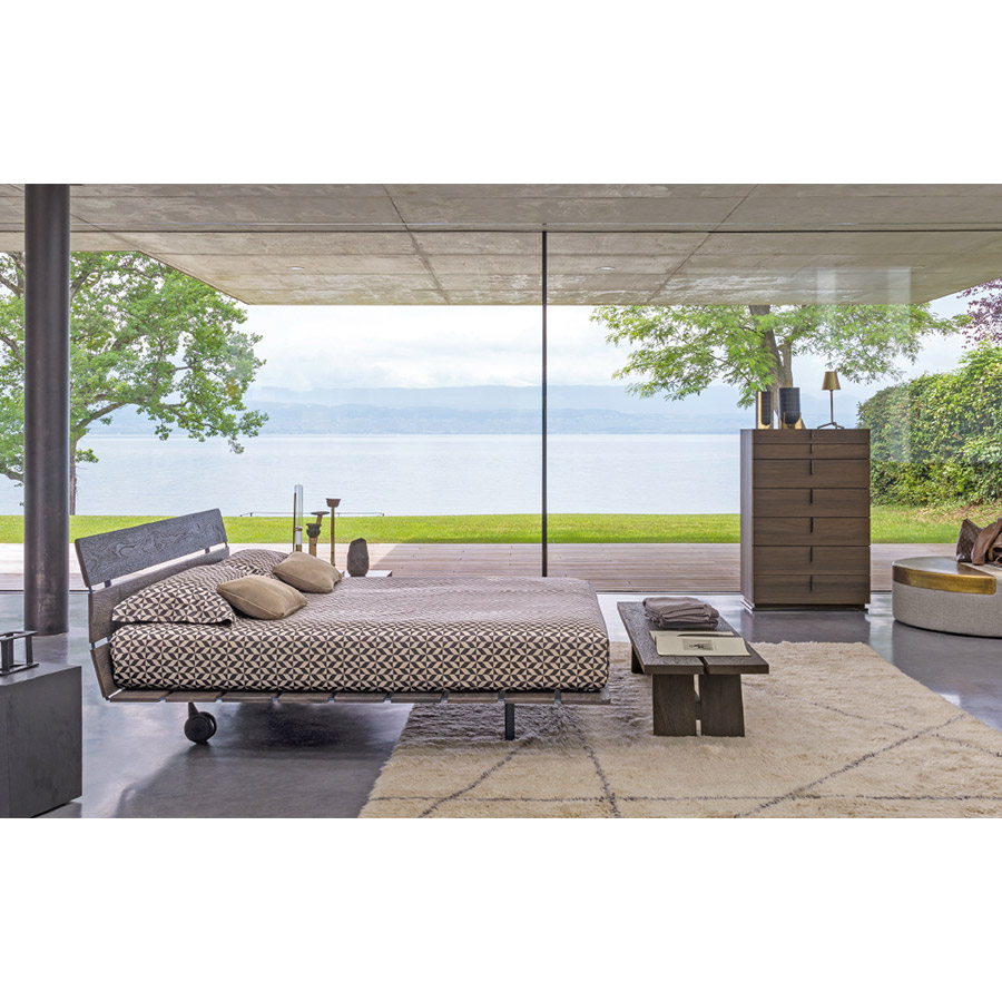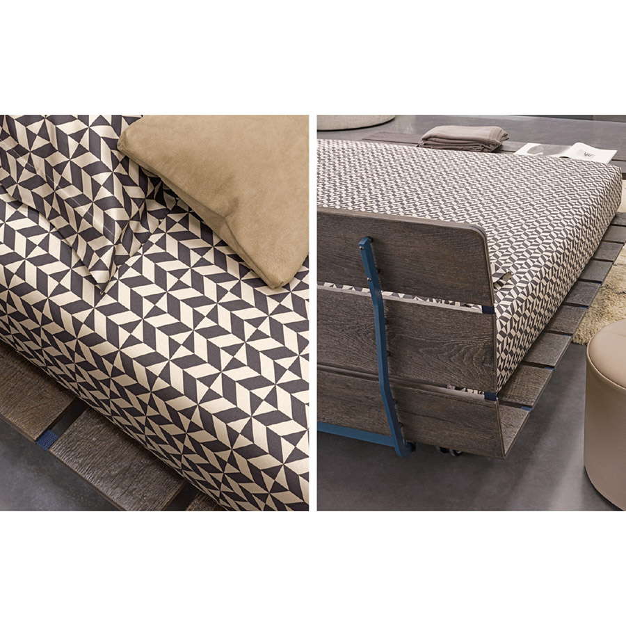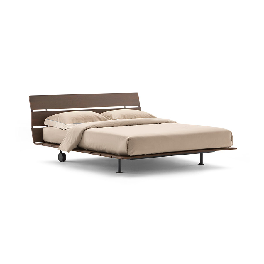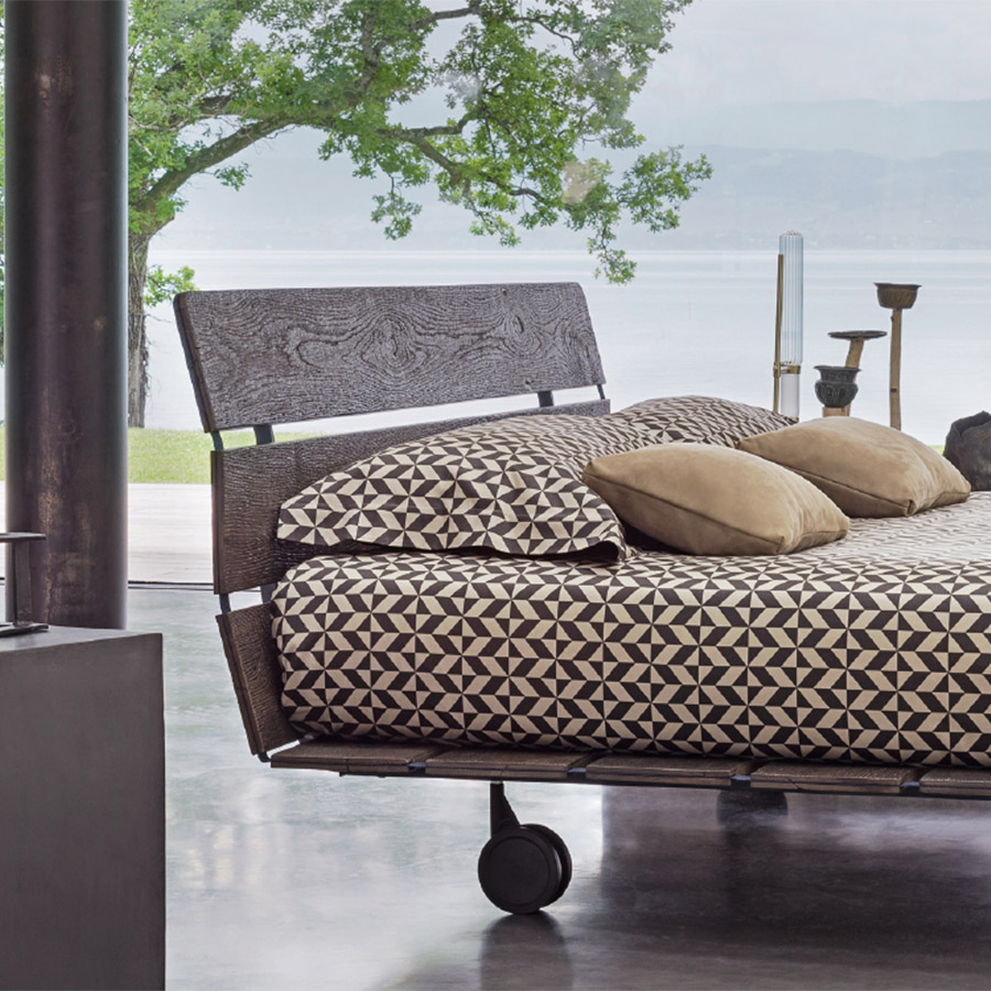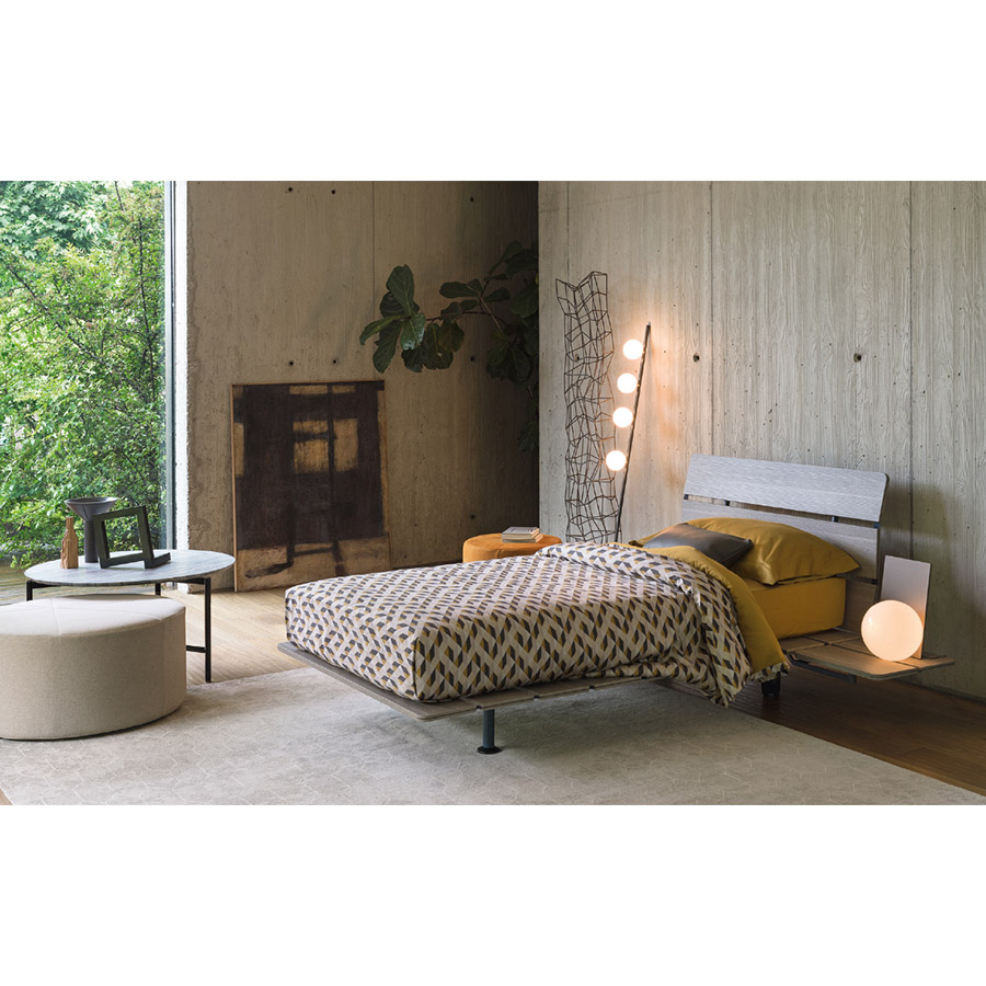 Vico MagistrettiOriental-inspired bed, refined and essential. The support base of the mattress is made up of portable slats that rise without interruption, forming the headboard. Tadao is available in larch (glossy or matt), Canaletto walnut, and brown oak, in the finishes Style (sand color), Epoque (white and grey) resistant to damage, and in primitive oak (oak reclaimed from planks, beams, and facades of old buildings, naturally aged by being exposed to bad weather for 200-300 years). Tadao in primitive oak is produced in a limited edition, compatible with obtaining the material that, bearing the signs of time, makes each unit precious, unique, and unrepeatable.