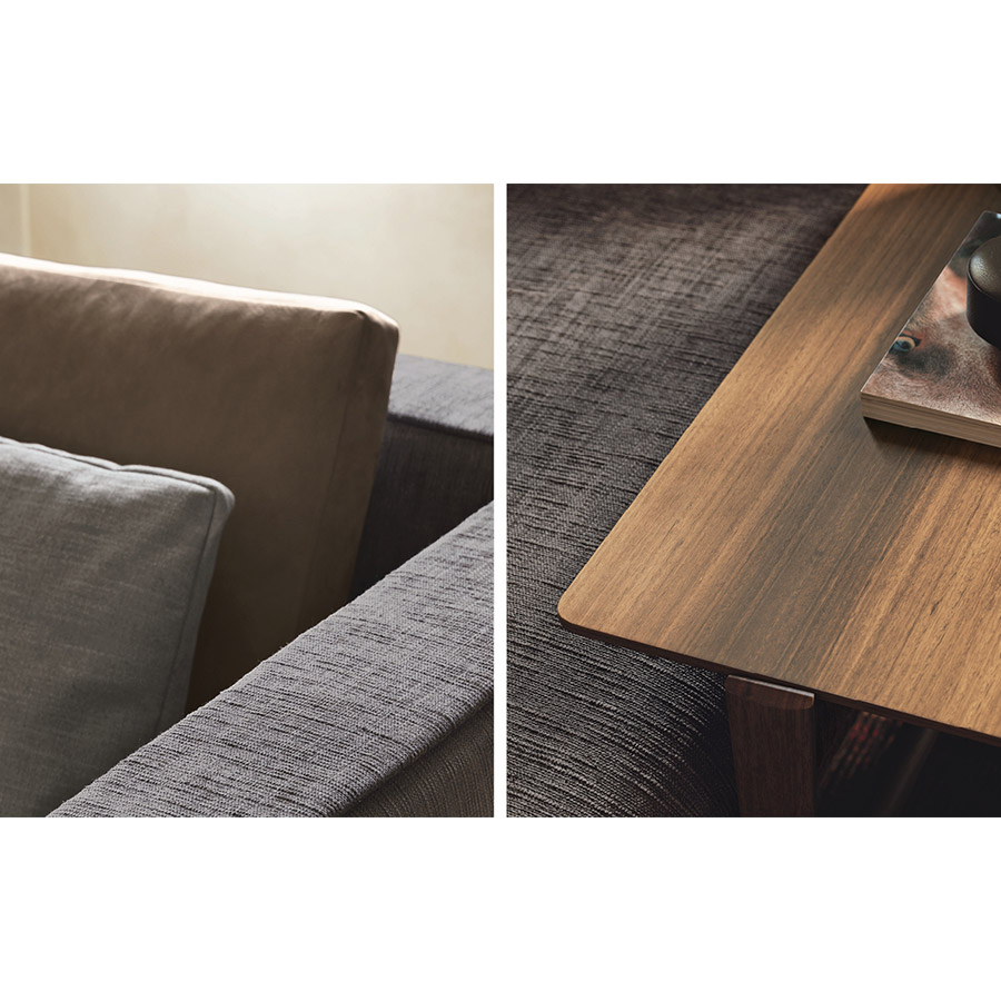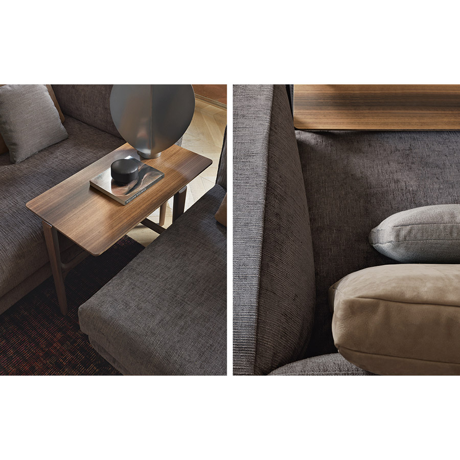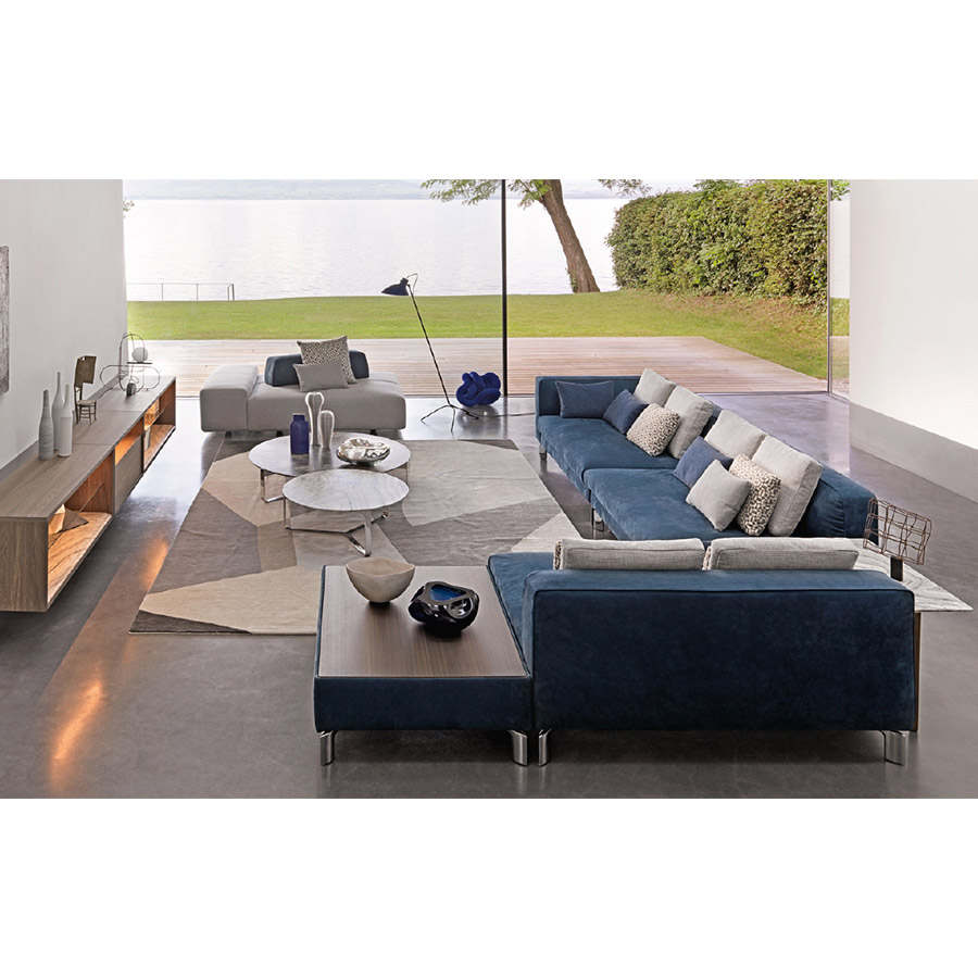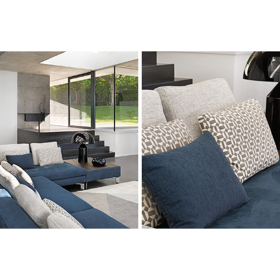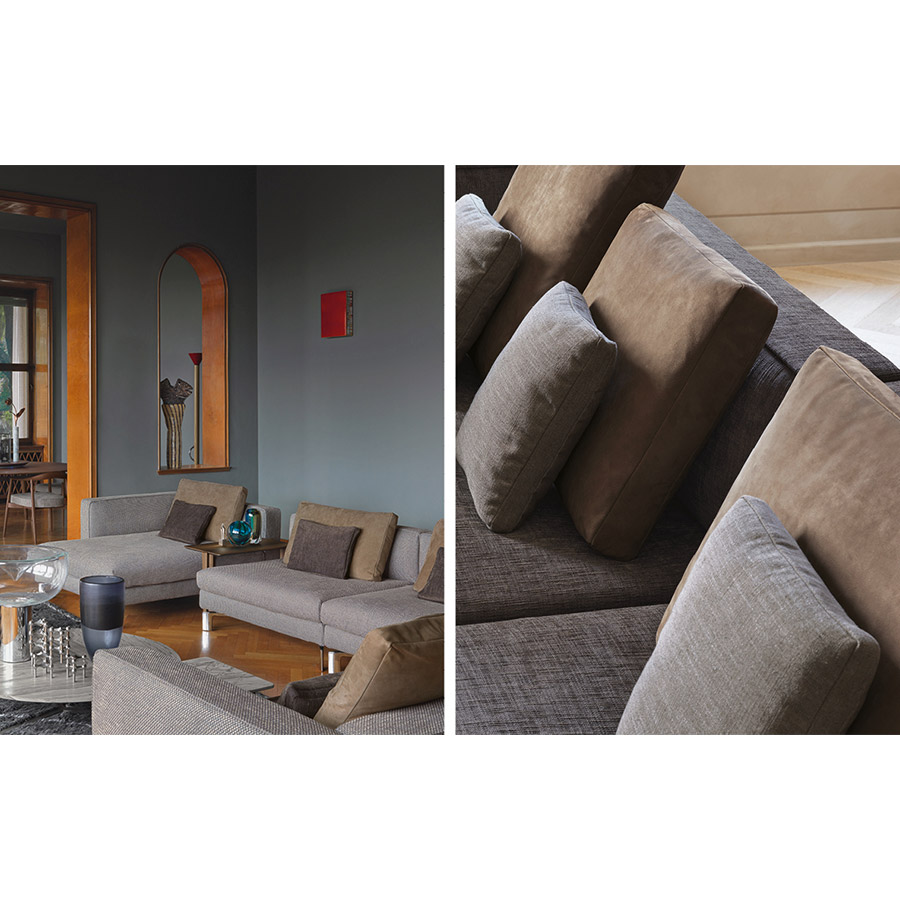 The elements that compose it are 4 base modules. Back-cushions and seat-cushions have different dimensions and shapes to offer the widest margin of freedom to create the most flexible and articulated compositions: in line, corner, with or without backrests, with or without arms, with chaise-chaise side extensions. longue and others. The structure rests on aluminum legs. The fully removable cover can be in fabric, leather or Dollaro Eco-leather. The exceptional comfort of the seat cushions is guaranteed by their inner core, made of memoform to make them even more welcoming.