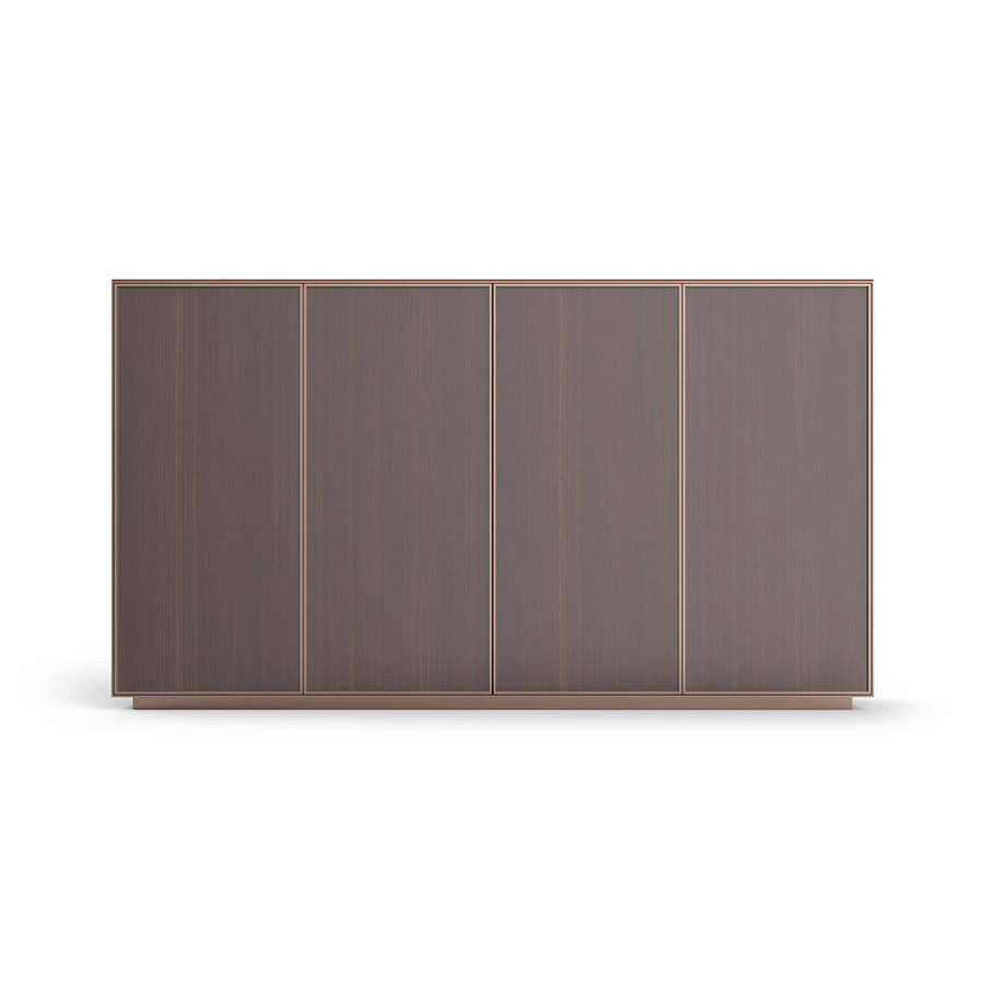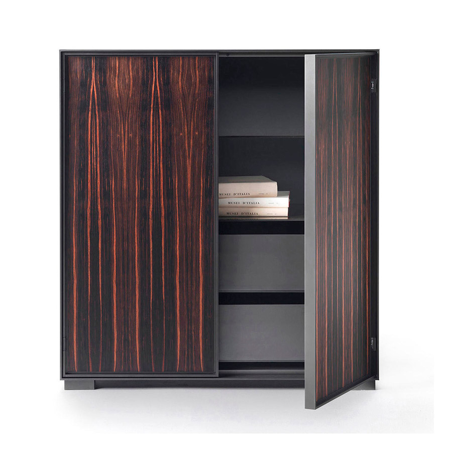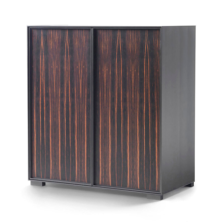 Carlo ColomboThe Taylor family of storage elements, characterized by an essential and modern line and refined construction details, has a wide range of elements and finishes. Its light structure is in burnished aluminum, while the hinged or sliding doors can be upholstered in leather or veneered in American walnut, ash, and amara ebony, in various refined colours. The countertop can also be made in essence to achieve an effect of continuity with the side, or in marble to create a design contrast. The furniture is kept slightly off the ground by means of burnished metal legs. Taylor storage elements are now available in a variety of different configurations, vertical as well as horizontal, that meet different needs and multiply the possibilities of placement in the home, from the hall to the living room or bedrooms.