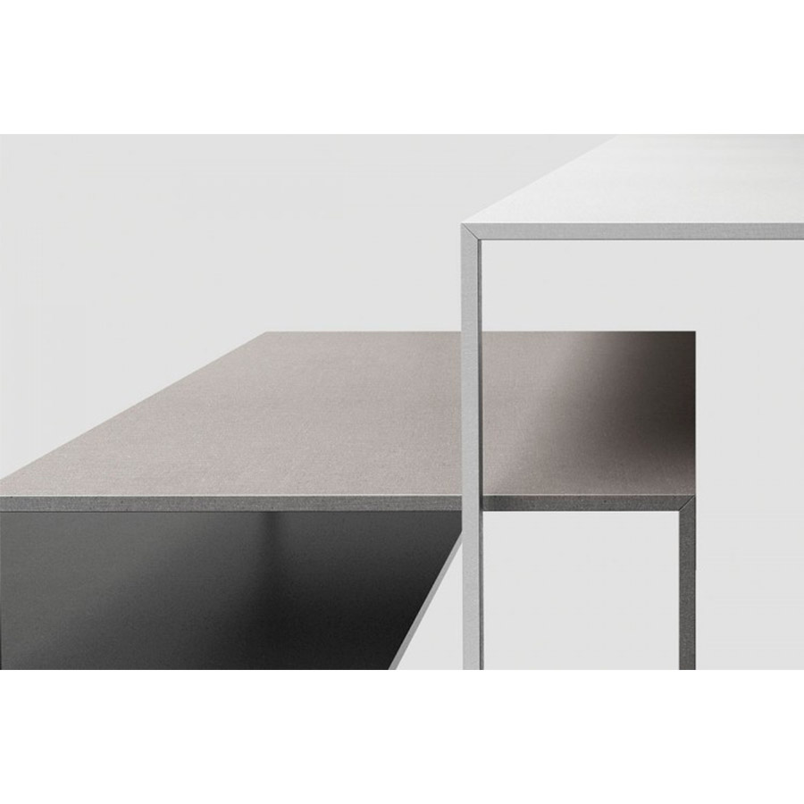 Stone countertop: its natural and smooth surface has irregular tones, typical of sedimentary stones. The handmade application of this mixture makes each table different from the others, as well as original and unique. The industrial and, at the same time, natural style of this finish adapts to different contexts: from minimalist and contemporary living rooms to classic dining rooms.