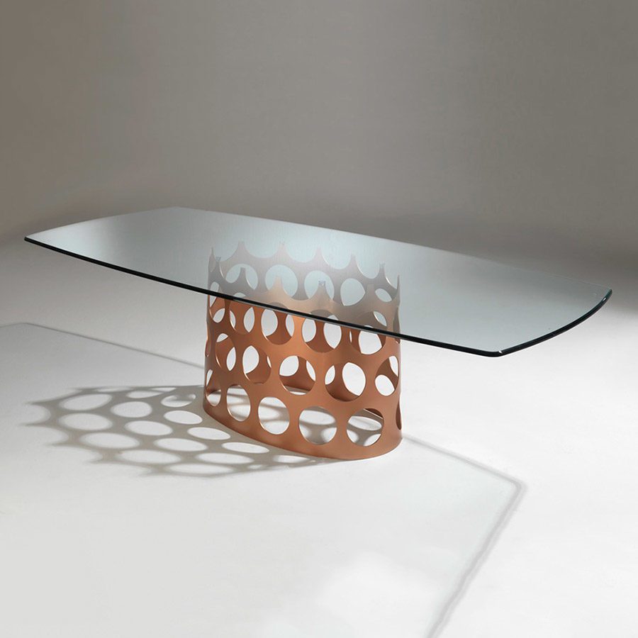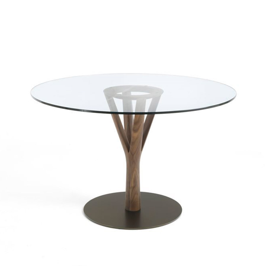 P. JouinRound table with central structure in solid canaletta walnut mounted on a metal disk in bronzoro finish and tempered glass top (thickness mm. 12) with UV-glued stainless steel plates. Available in round, 80-100-120 diameters, this table offers two height versions, the standard 75cm dining room version and a more lounge version of 65cm height, ideal for combining with armchairs.