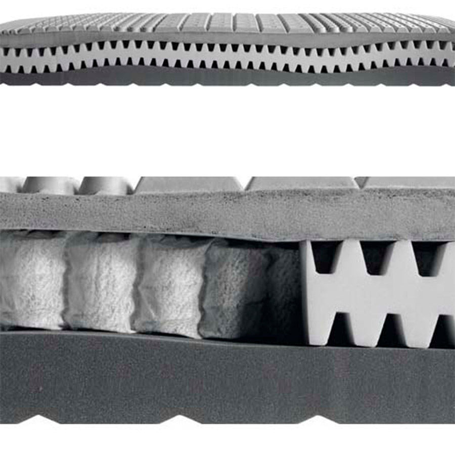 1st layer: ergonomic block in thermoregulatory viscoelastic PCM with 7 molded zones with anatomical wavy pattern.