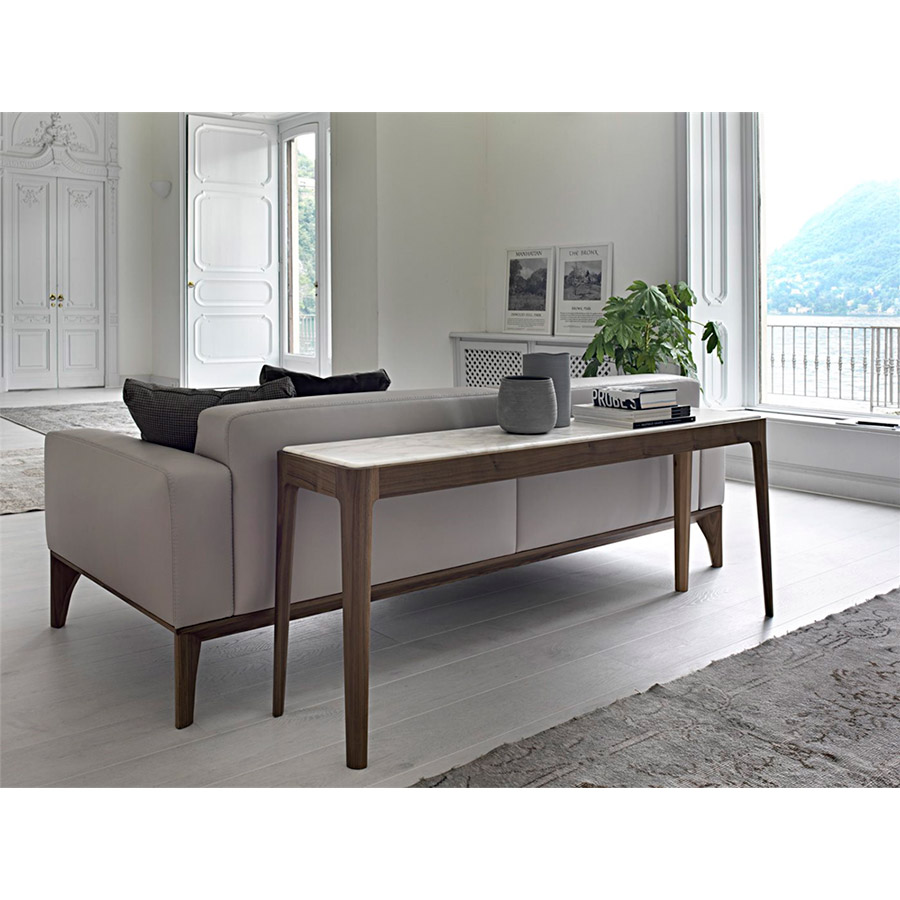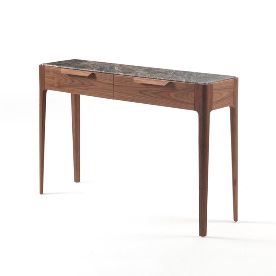C. BallabioConsole with two drawers with structure in solid canaletta walnut and top in wood, marble, or black-lacquered etched glass.