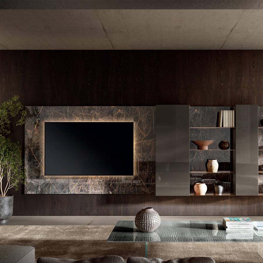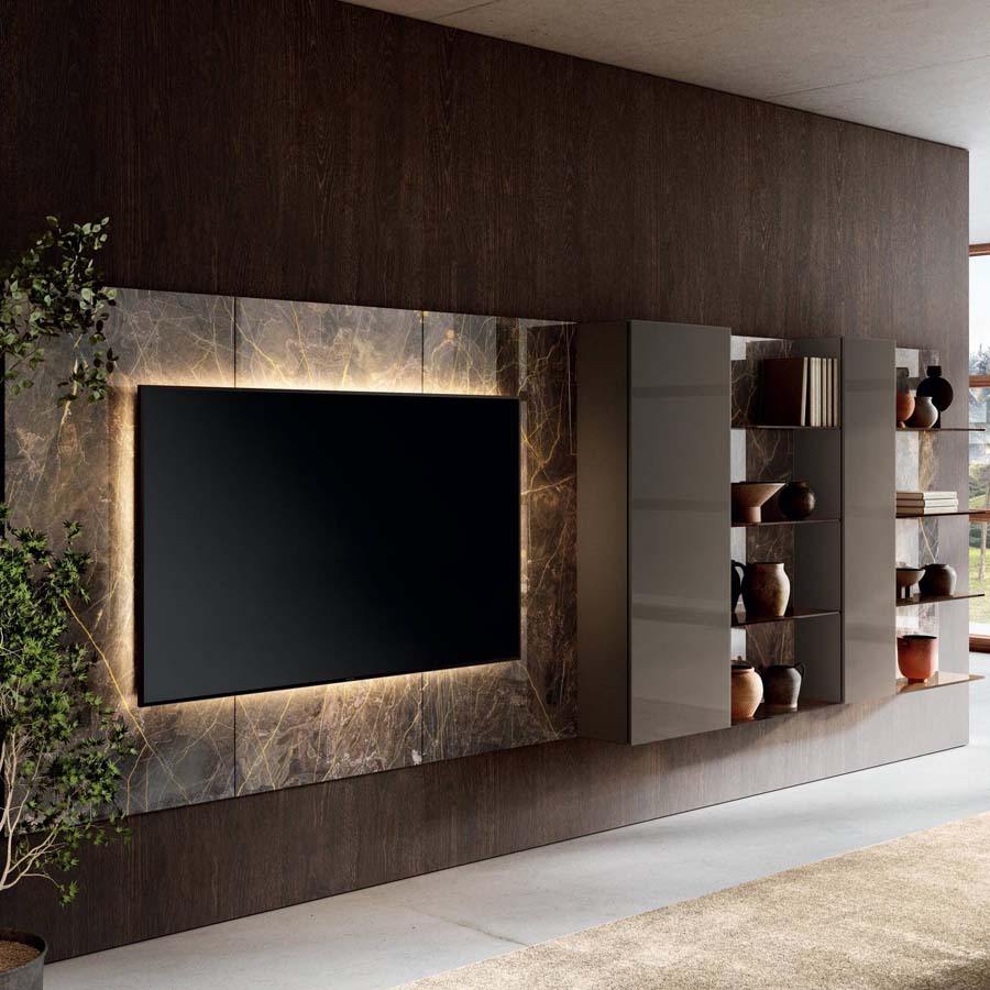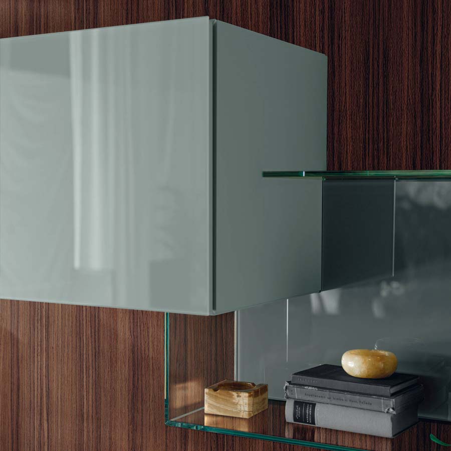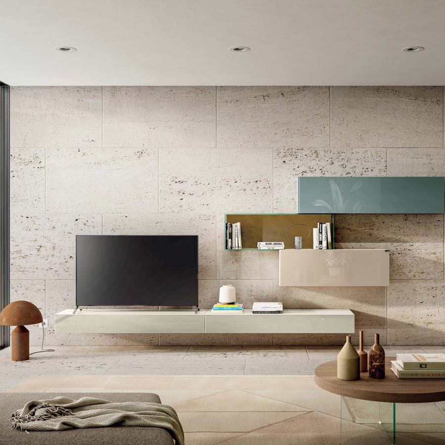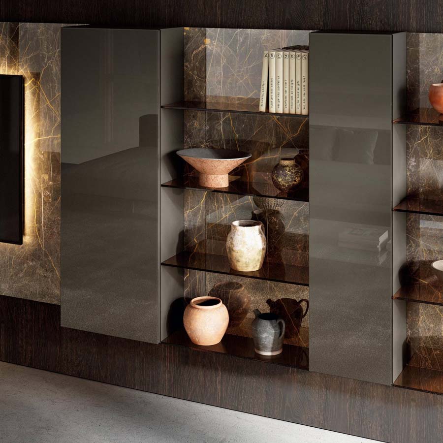 La ausencia de tiradores en las superficies de los almacenadores permite preservar el diseño sobrio del producto, asegurando la funcionalidad de una cómoda apertura integrada en los módulos. Un refinado sistema de iluminación de LED enriquece la pared equipada y permite crear atmósferas únicas que generan emociones y llevan calidez al salón.