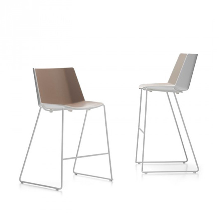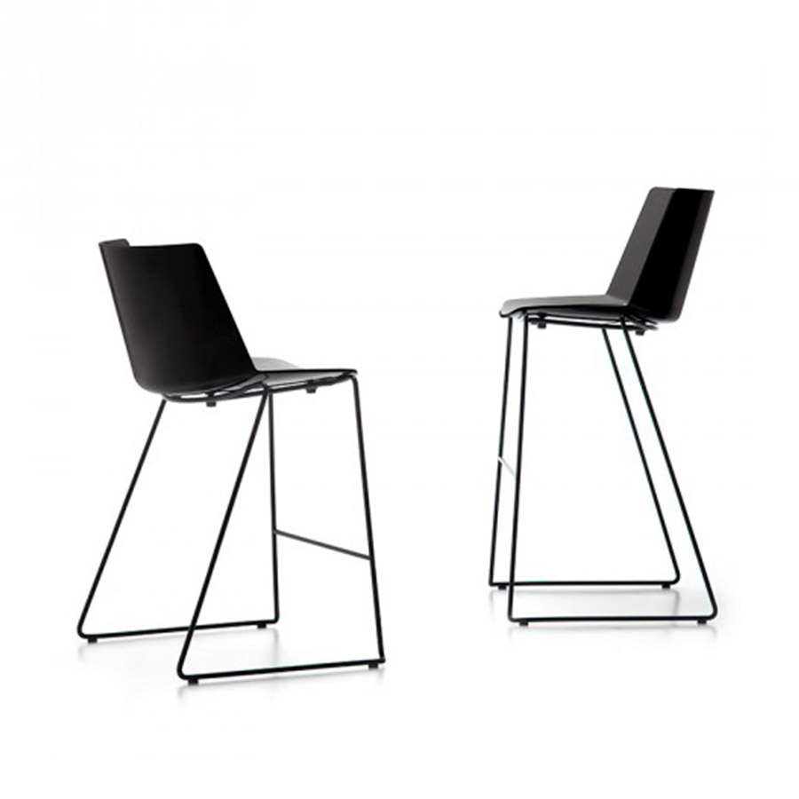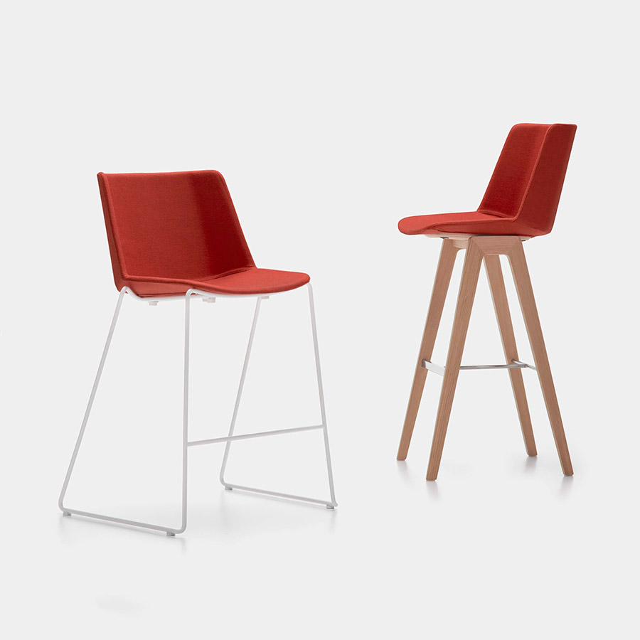 El taburete Aïku, elegante, agradable e inteligente, viene con base de madera o con trineo.