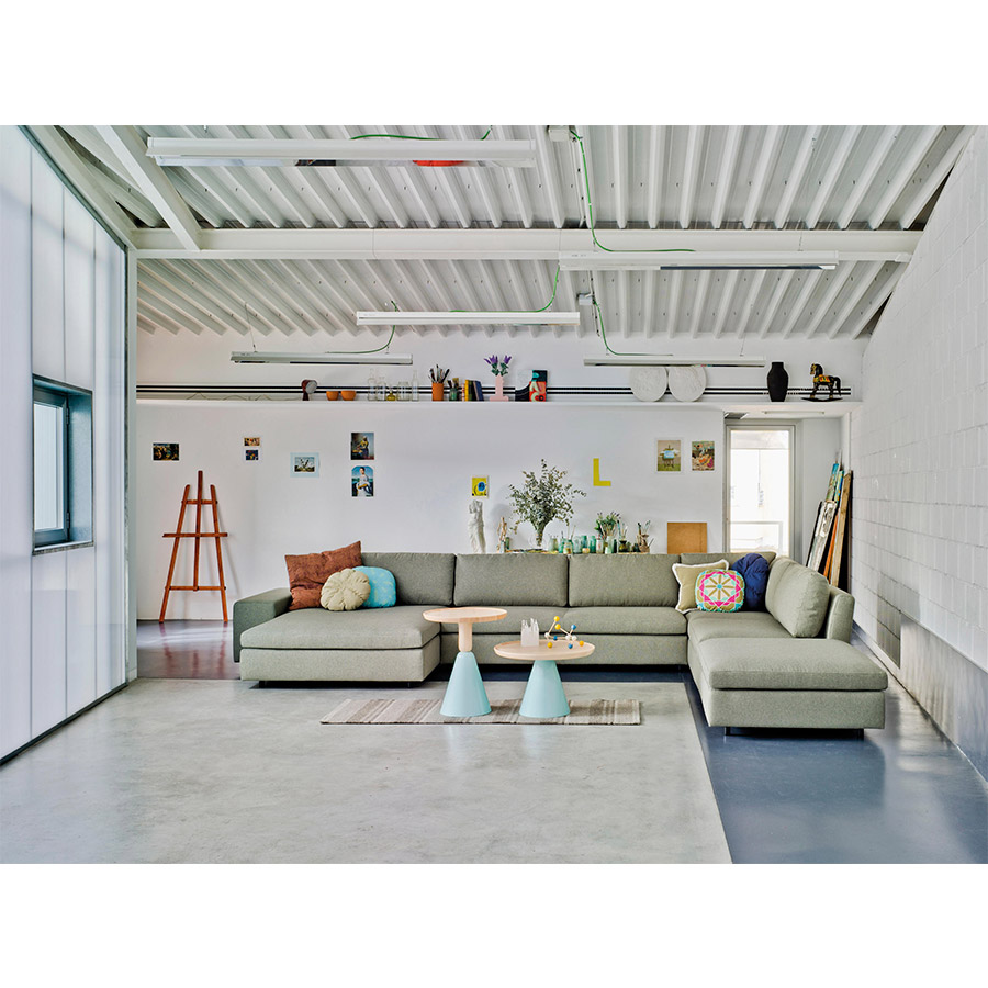 Su diseño modular permite jugar con diferentes fondos y alturas, además de elegir entre varios tipos de brazos: anchos, estrechos o altos. Gracias a sus patas ocultas de aluminio, da la sensación de flotar, aportando un toque ligero y moderno.