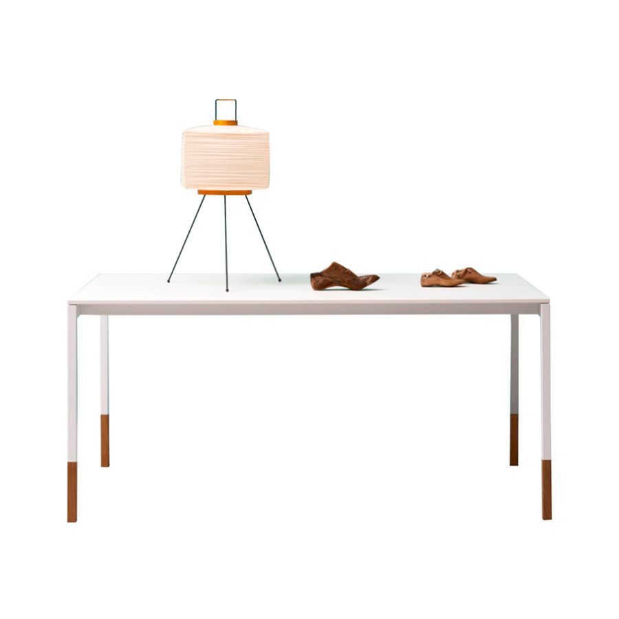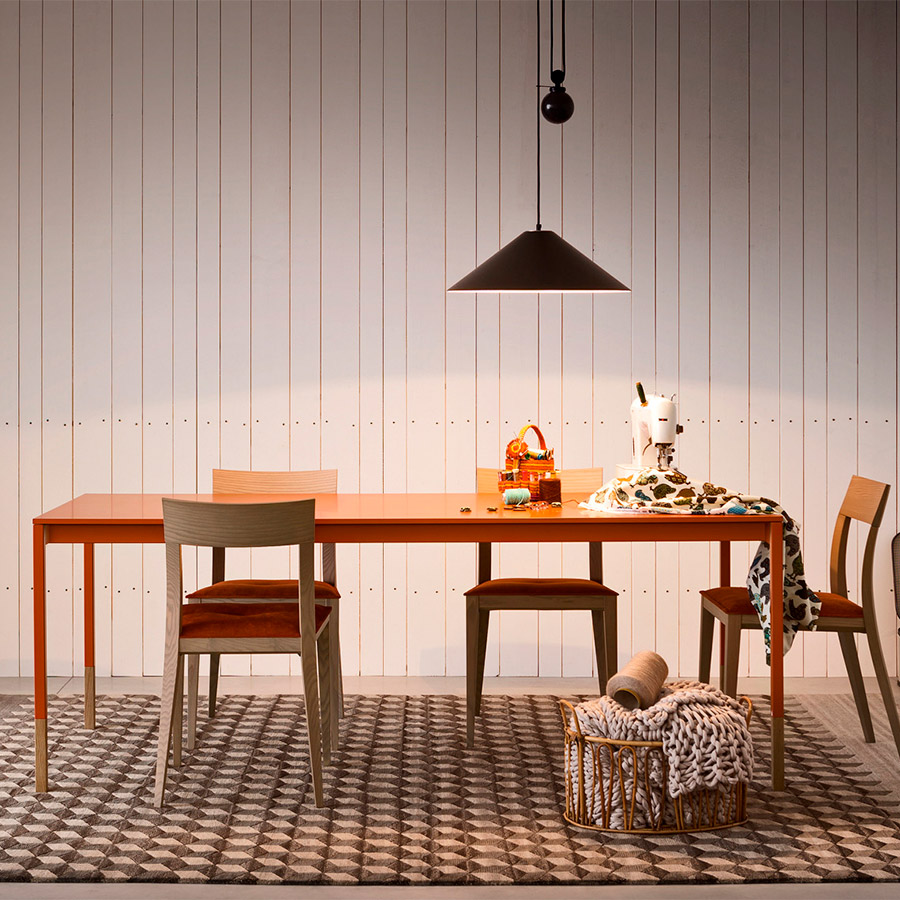 Bruna VaccherAliante es una mesa con estructura de metal, cuadrado o rectangular, disponible en versión fija o extensible. Esta mesa se caracteriza por incluir unos “calcetines” de madera, en diversos acabados que se pueden combinar libremente con los lacados de la parte superior.