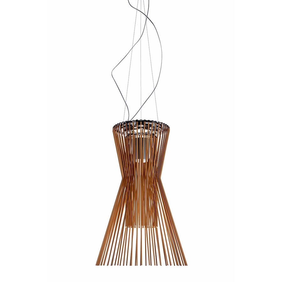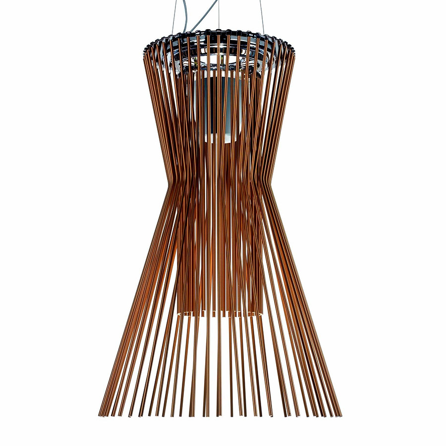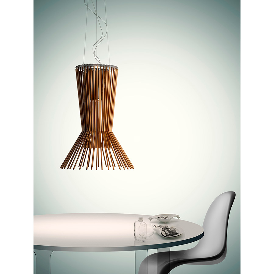 Atelier OïAllegro es una familia de lámparas de suspensión que toman forma gracias a la fuerza de gravedad, realizadas con líneas metálicas que dibujan la luz y emiten sonidos cuando se rozan. El nombre de la colección se inspira precisamente en esta «musicalidad». Tres posibles versiones, según el acabado de los elementos de metal, para expresar tres estilos distintos: Allegro Ritmico en grafito, Allegro Vivace en cobre y Allegro Assai en oro. Su gran tamaño hace que sean adecuadas para resaltar grandes ambientes, tanto públicos como privados, garantizando una iluminación difusa, directa hacia abajo y reflejada en el techo.