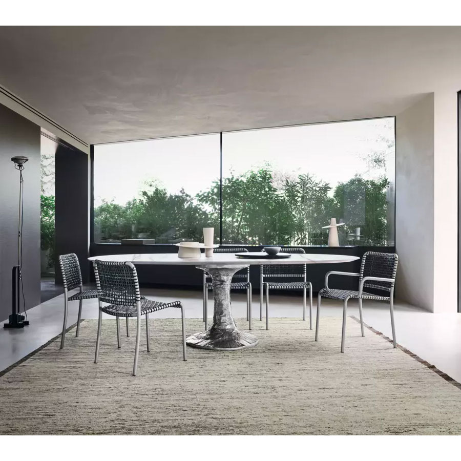 Paola NavoneVersátil y confortable, la familia de sillas Allu combina la ligereza y la esencialidad de la estructura de tubo de aluminio anodizado con un juego dinámico de texturas, creado por el entramado de pergamino natural o gris. Capaz de integrarse en cualquier ámbito, desde el doméstico hasta el contract, Allu es un producto caracterizado por líneas limpias y formas geométricas y esenciales, y se presenta en dos variantes: silla y sillón con brazos.