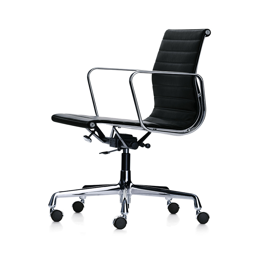 Los modelos EA 117, EA 118 y EA 119 son las sillas de trabajo del Aluminium Group diseñado por Charles y Ray Eames. El mecanismo de inclinación del asiento puede ajustarse al peso del usuario ofreciéndole un confort óptimo. La amplia selección de colores de tapizado permite encontrar con facilidad la silla perfecta para cada oficina doméstica. La Aluminium Chair EA 119 se distingue de las EA 117 y EA 118 por su respaldo más alto. La EA 118 tiene un asiento algo más estrecho y la posición es más indicada para trabajar en una mesa.