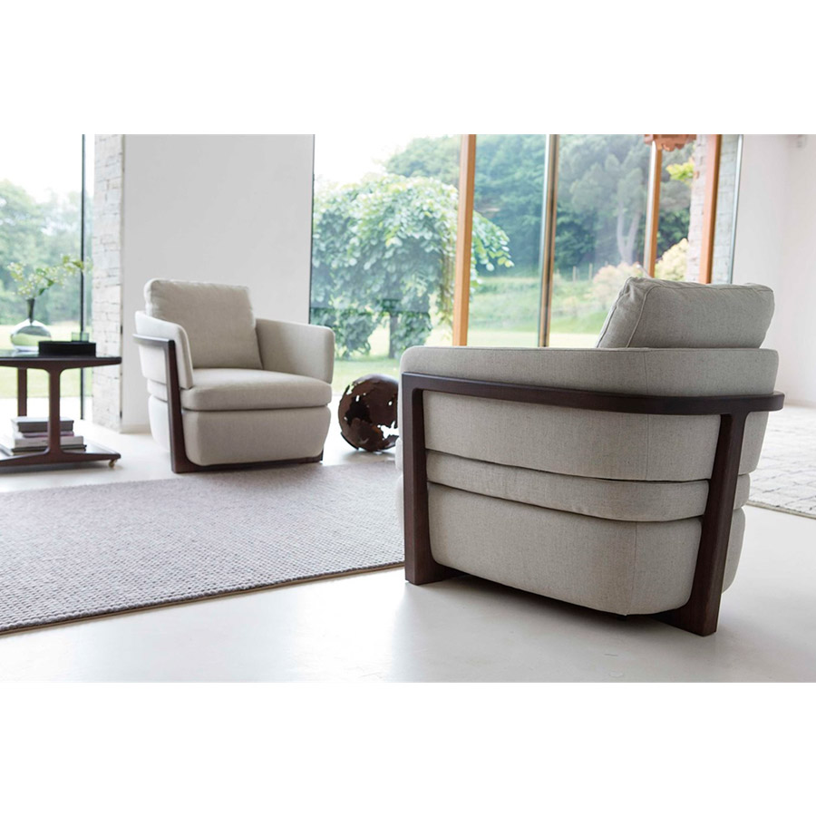 E. GallinaButaca con estructura de fresno macizo y revestimiento en las telas de la colección. Es posible combinar telas distintas entre estructura revestida de la base y del respaldo y los cojines del asiento y del respaldo. Cojines desenfundables. Dimensiones: 85x96x73H