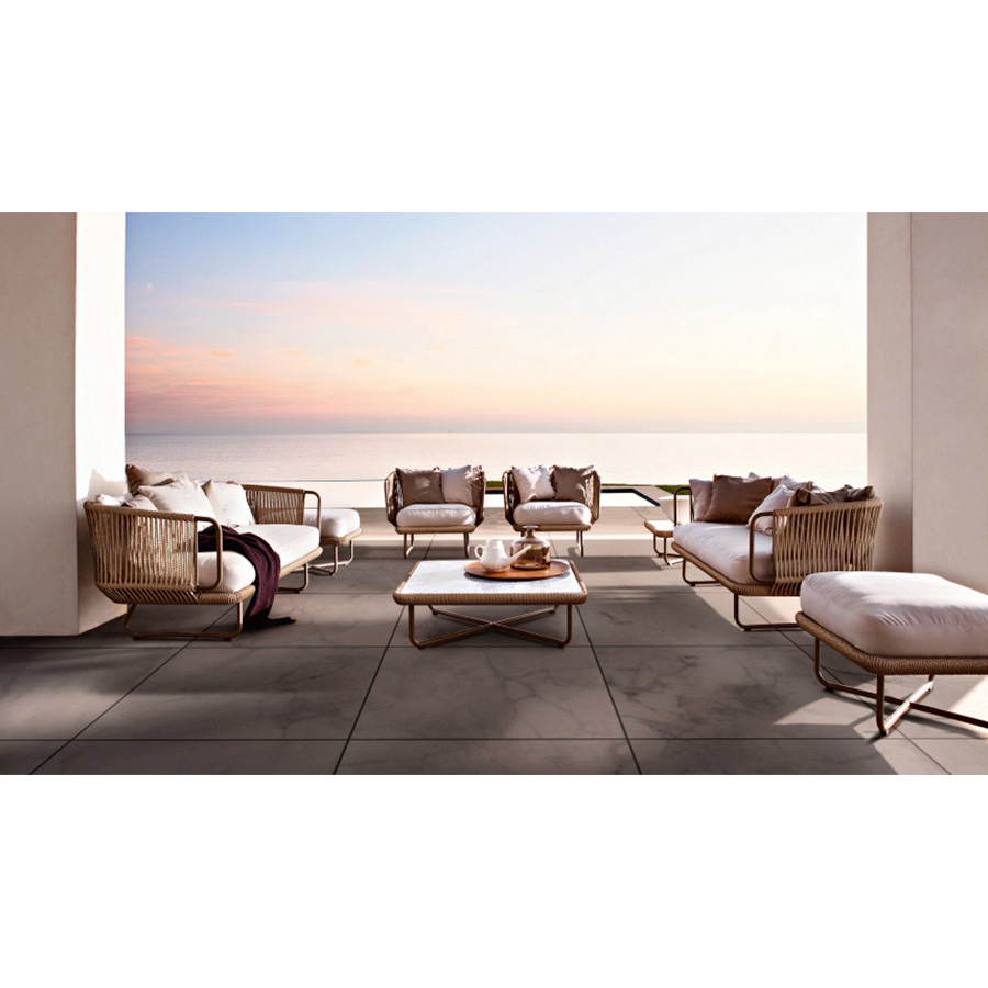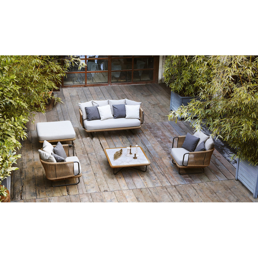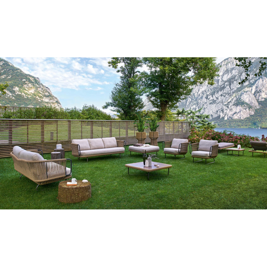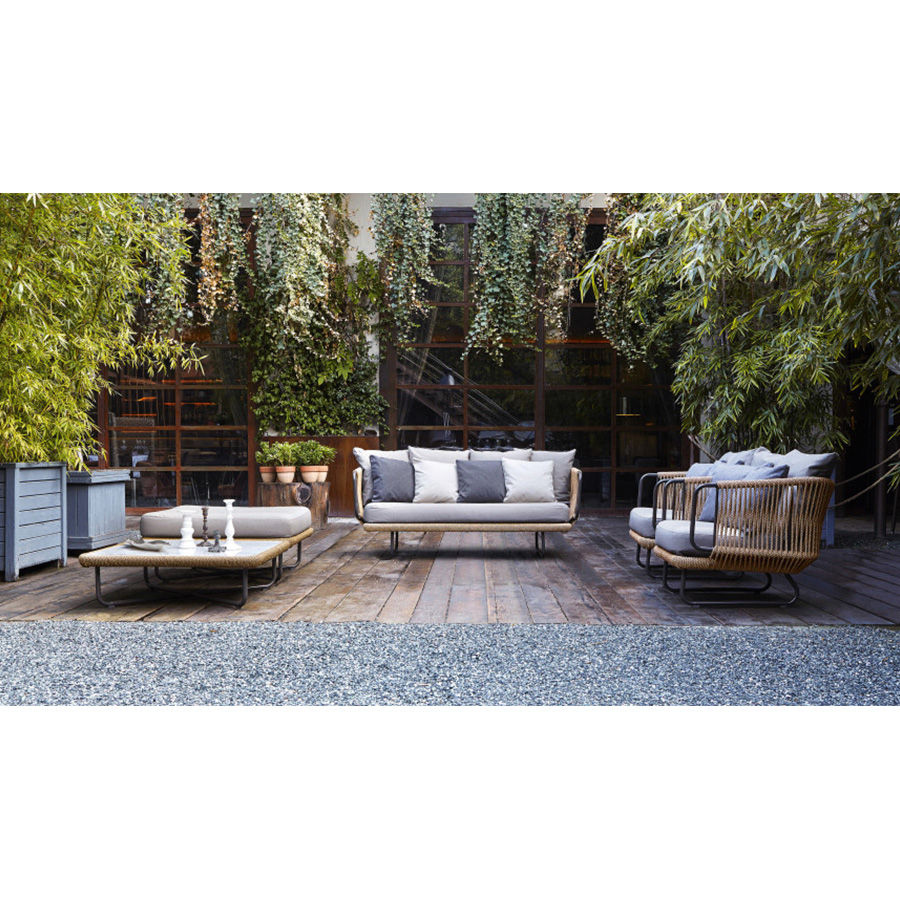 Giopato & CoombesEsta colección incluye sillas y mesas de aluminio barnizado decoradas con cuerda de fibra sintética. Es un sillón con diseño tejido a mano ideal para decorar con estilo una terraza, una habitación o sala de estar.