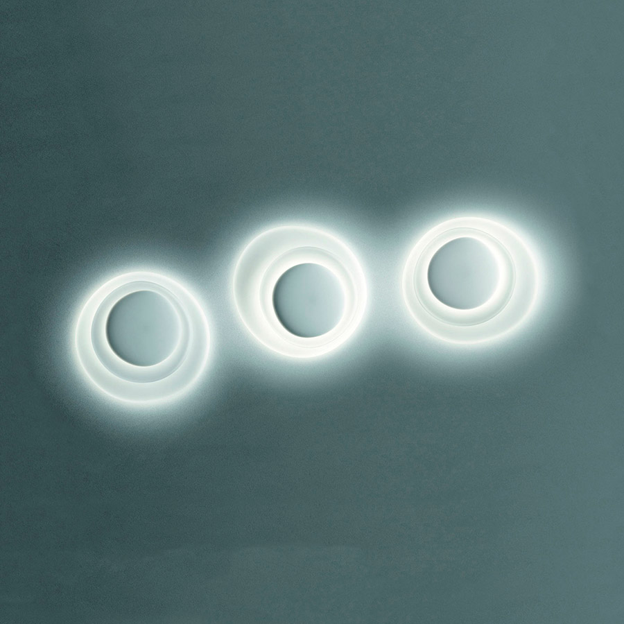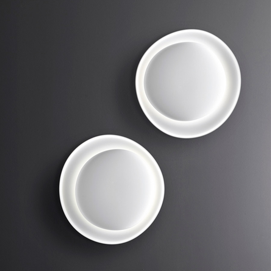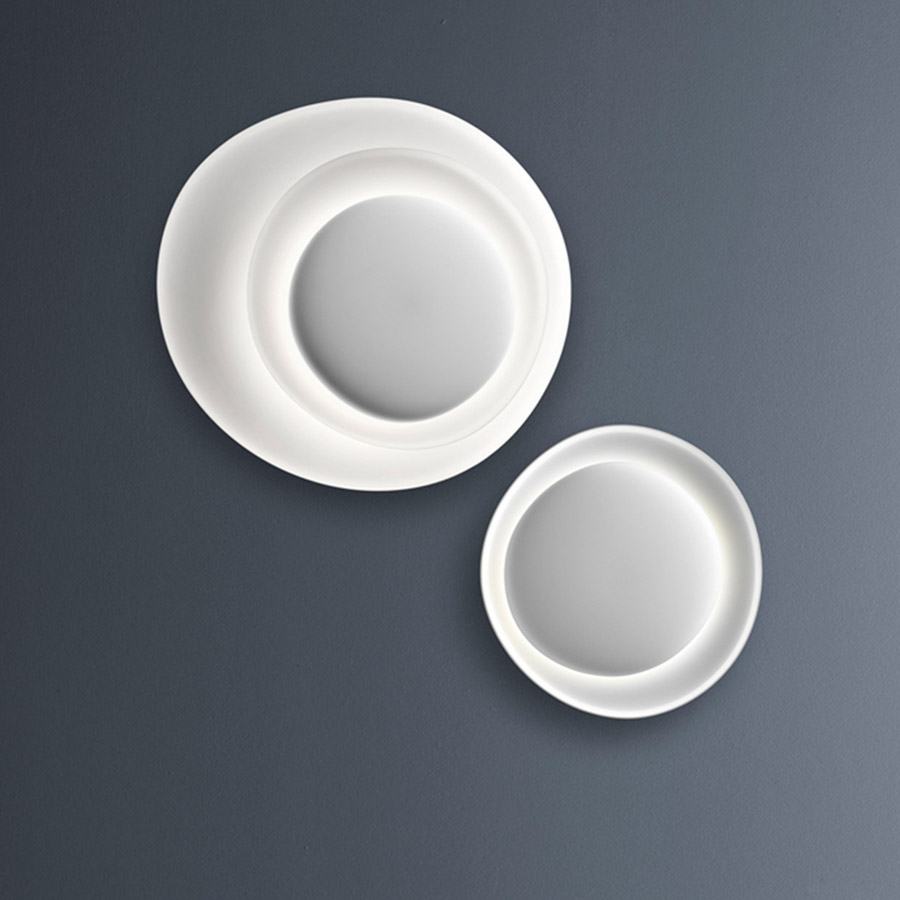 Lucidi PevereLámpara de pared y de techo de luz reflejada y difusa. Formada por dos platos ovalados en policarbonato mate blanco estampados por inyección y montados asimétricamente. El plato más grande hace las veces de sujeción de pared, el plato central esconde la parte luminotécnica.