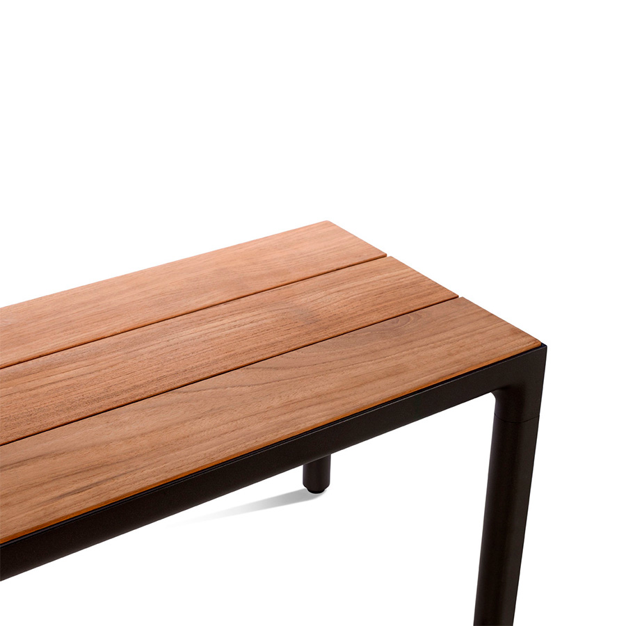 Marc Merckx Pieter MaesEl banco, gracias a sus delgadas patas y sus preciosos perfiles redondeados, es puro y simple. El marco de aluminio es fácil de mantener. Per el asiento de teca, Tribù solo utiliza la mejor teca que se puede encontrar en Java: una madera de primera clase con un grano recto procedente de plantaciones gestionadas de forma sostenible.