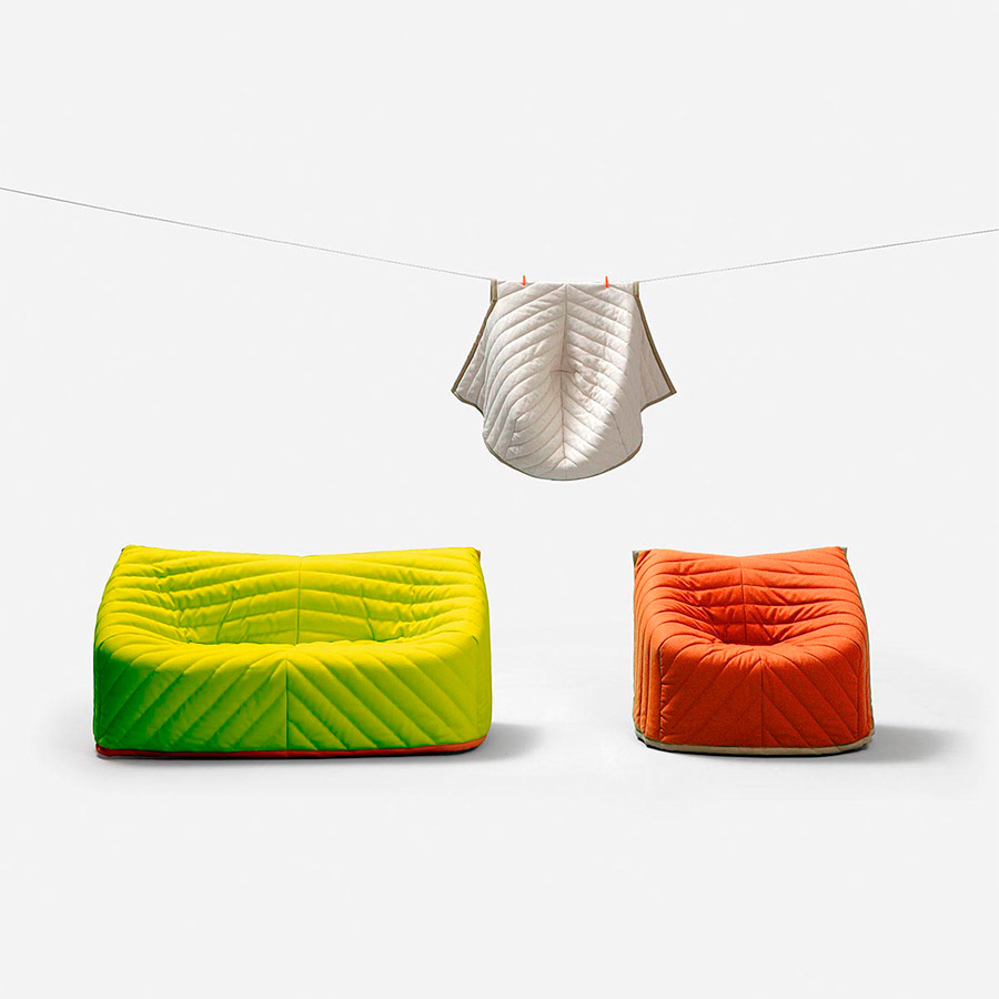 Perrine & Gilles dan una vuelta de tuerca a un viejo recuerdo de la infancia: las sábanas que nuestras abuelas ponían encima del sofá para protegerlo de nuestras “pezuñas”. Esta antigua costumbre forma parte de la tradición popular mediterránea, así que nos pareció todo un acierto trabajar en ella desde un punto de vista contemporáneo. De este “experimento” surge el dúo de sofás y sillones Barnaby. Tras un arduo trabajo de patronaje conseguimos que el textil que recubre la estructura se pueda acolchar respetando las proporciones exactas de cada uno de sus volúmenes. Al tratarse de una funda suelta, Barnaby puede enfundarse y desenfundarse fácilmente; y permite disponer de fundas adicionales para cambiar rápidamente de look según las necesidades del momento. Las cintas laterales dan color y remarcan las esculturales formas del diseño.