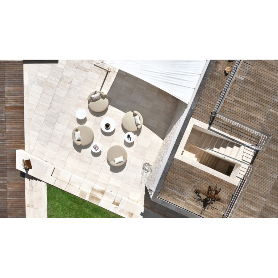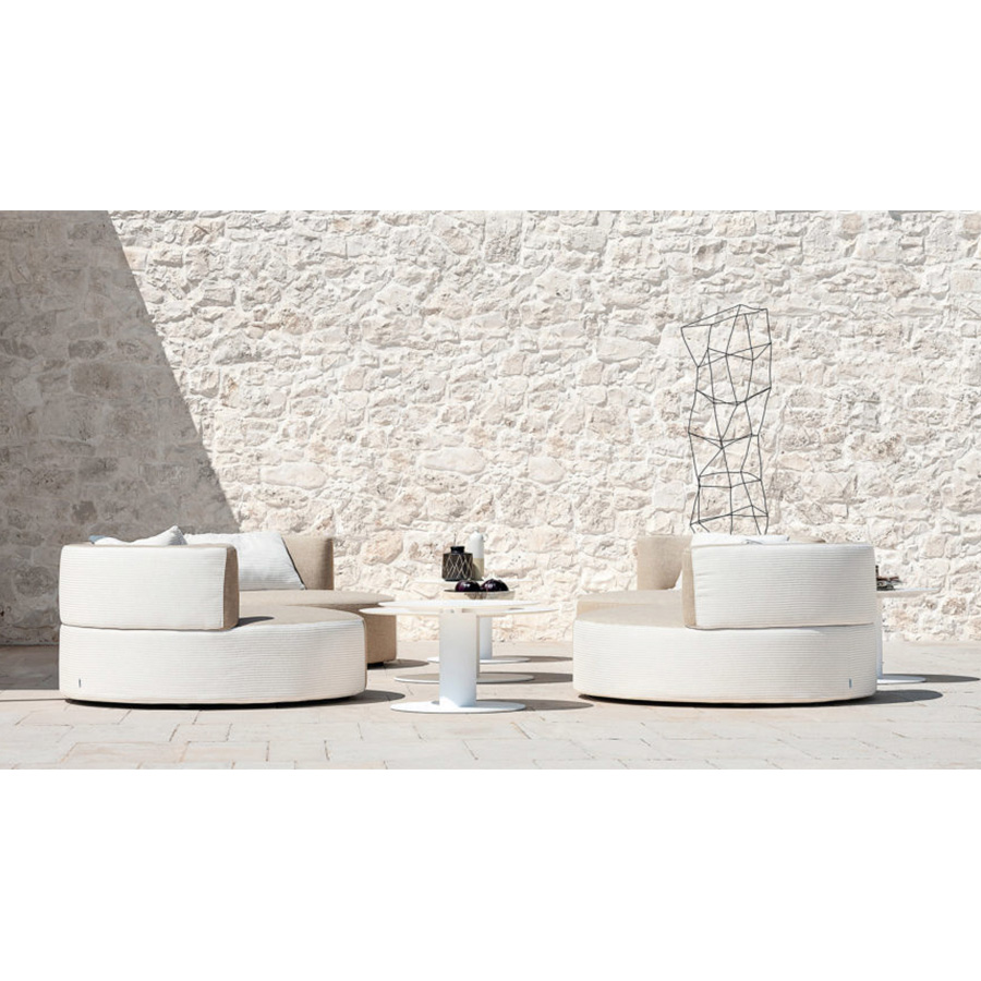 El sillón de cinturón tiene una forma redondeada disponible en dos medidas, ø 135 cm o 90 cm y está disponible en versión mono o bi-tela. Es ideal para uso en exteriores y resistente a la intemperie.