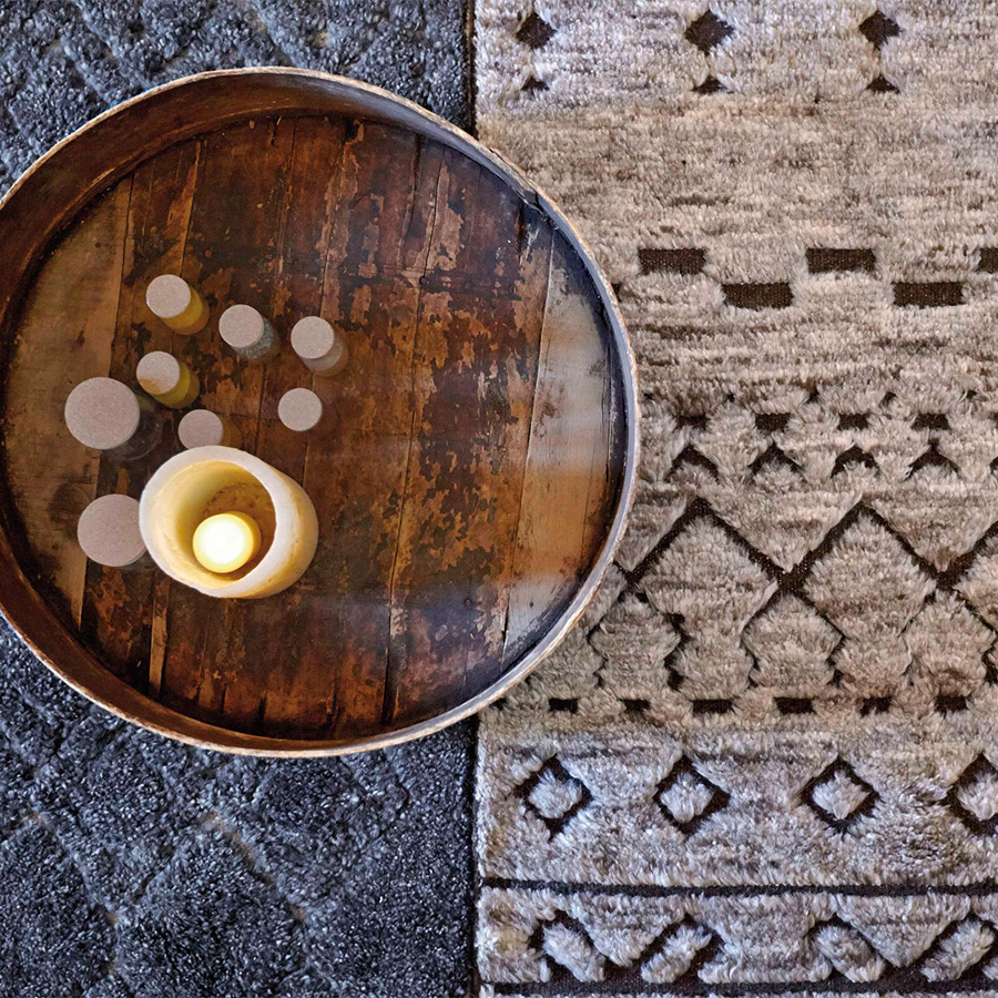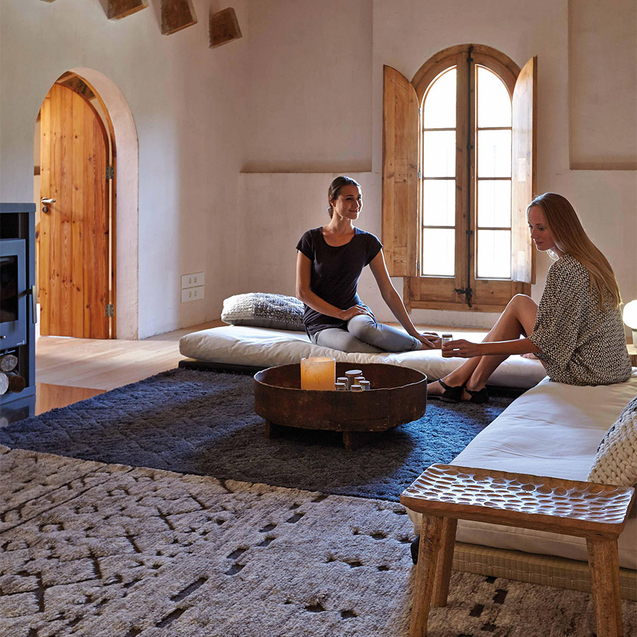 Modelo Natural de nuestra serie Bereber, una suave alfombra confeccionada manualmente nudo a nudo con técnicas tradicionales de origen marroquí empleando 100% lana virgen de Nueva Zelanda. Es un diseño que mezcla diferentes patrones de dibujo anudados de un modo muy prieto, lo que produce una sensación como de superficie imprecisa y difusa. Además, su color presenta unas sutiles y atractivas variaciones de matiz. Esta pequeña aleatoriedad en su color se debe a que Bereber se realiza con hilos de lana teñidos con la técnica tie-dye, un método en el que se usan nudos a la hora de teñir un textil, aplicado en este caso a las hebras. Como consecuencia de este singular sistema, las hebras pueden presentar varios colores e, incluso, degradados. Creado por el equipo interno de diseño de GAN, es un modelo disponible en tres medidas y en otra versión de tonos grises azulados.