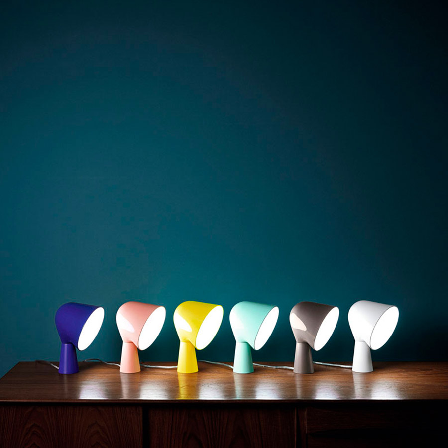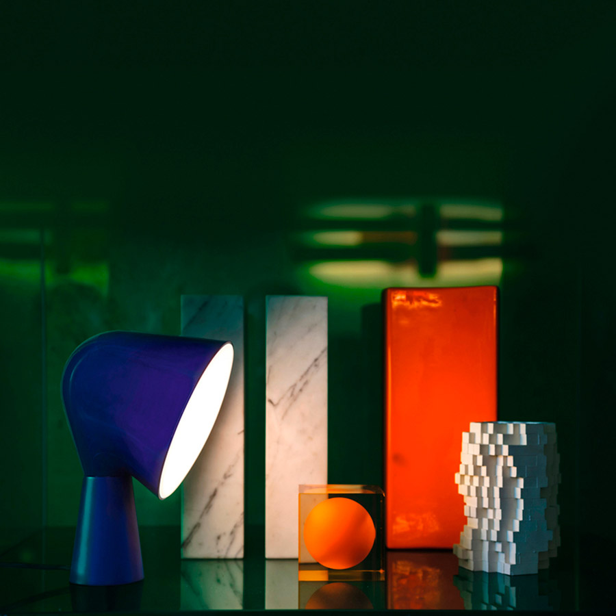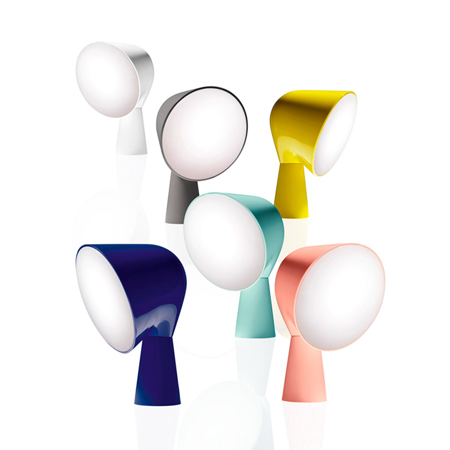 Binic es el nombre de un pequeño faro en la costa de Bretaña, la región natal de la diseñadora lonna Vautrin, que le ha servido de inspiración para crear esta pequeña lámpara de mesa de gran personalidad. Su forma alegre y sus colores estimulan la imaginación y suscitan una inmediata simpatía. El volumen superior redondeado, con acabado brillante, se apoya sobre una base cónica satinada, proyectando hacia abajo una luz intensa, restringida y homogénea. Gracias a su gama de 6 colores actuales se sintoniza con la personalidad de quien elige su versión preferida y puede amueblar diversos ambientes domésticos como el estudio, el dormitorio de los niños o de los adultos, o un rincón personal de la zona de día. Un embalaje creado por la diseñadora, igualmente especial y divertido, propone Binic como objeto "take away'', idea regalo o lámpara personal.