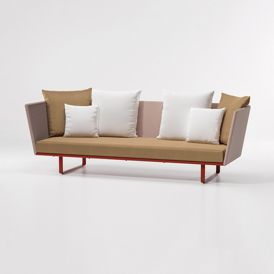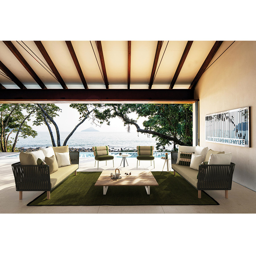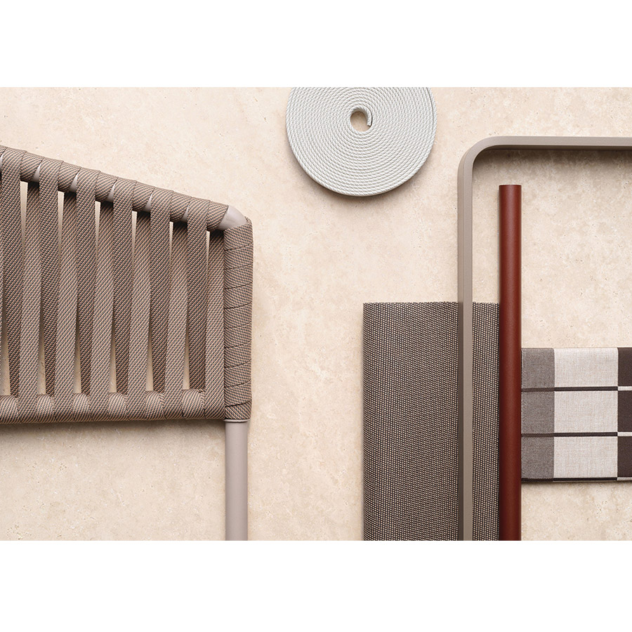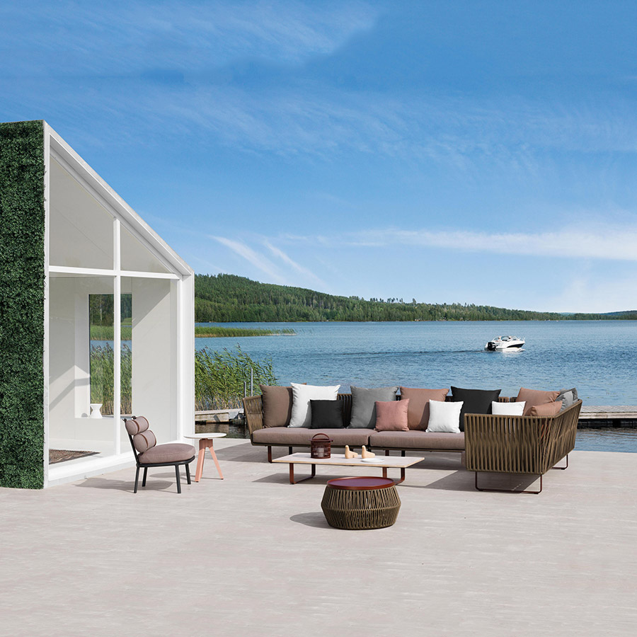 Rodolfo DordoniSofas de exterior de la colección Bitta de Kettal que se caracterizan por una combinación de estructuras de aluminio, asientos trenzados con cuerda de poliéster y cómodos cojines, madera de teka y piedra para los sobres de mesa, materiales perfectamente resistentes a la intemperie. “La intención del diseñador era crear un trenzado denso pero que respirara que recordara el trenzado de los cabos que se utiliza para amarrar las barcas a los amarraderos (de ahí el nombre Bitta, que significa ‘amarradero’ en italiano)–, que confiriera a las piezas una sensación de ligereza pero, que éstas se vieran como nidos acogedores en tonos naturales en los que relajarse.”