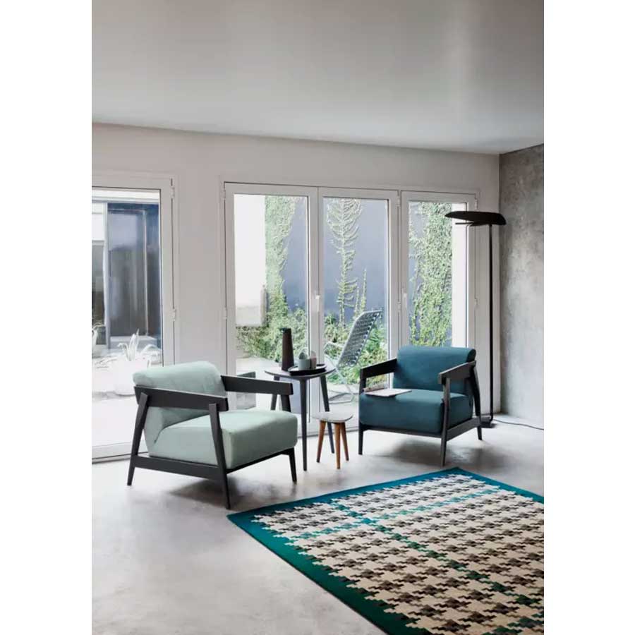 Paola NavoneSillón con estructura de madera maciza de nogal Canaletto natural, roble blanqueado o roble lacado en blanco, gris, negro, océano o tórtola, Brick 305 tiene el asiento y el respaldo mullidos gracias a un único e importante cojín relleno de poliuretano expandido, con funda extraíble. Los variados elementos de madera que componen la estructura son evidentes, inclinados y superpuestos.