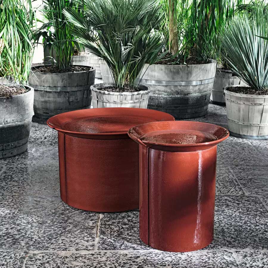The collection consists of round coffee tables with a cylindrical base and removable top in Millgres, available in different sizes and heights and in a dynamic color palette in which red and cream are complemented by blue.