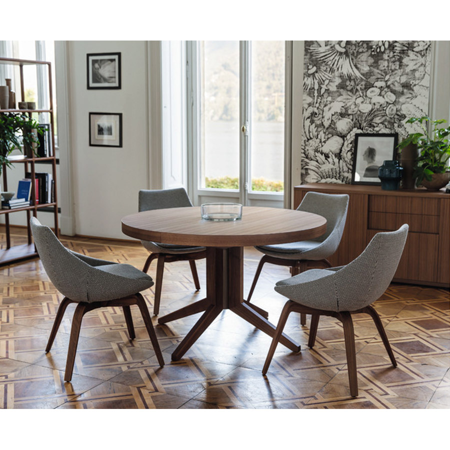 Opera DesignMesa de comedor redonda con base en roble o nogal canaletta macizo. Extensible. La extensión central se repliega debajo de la tapa.
