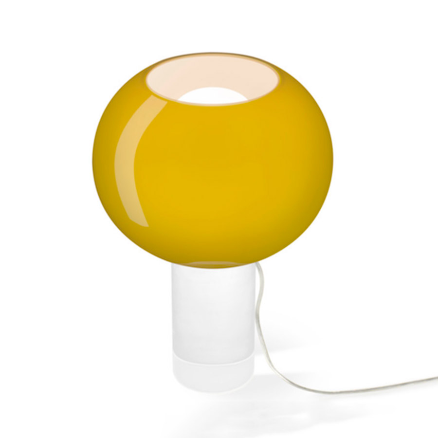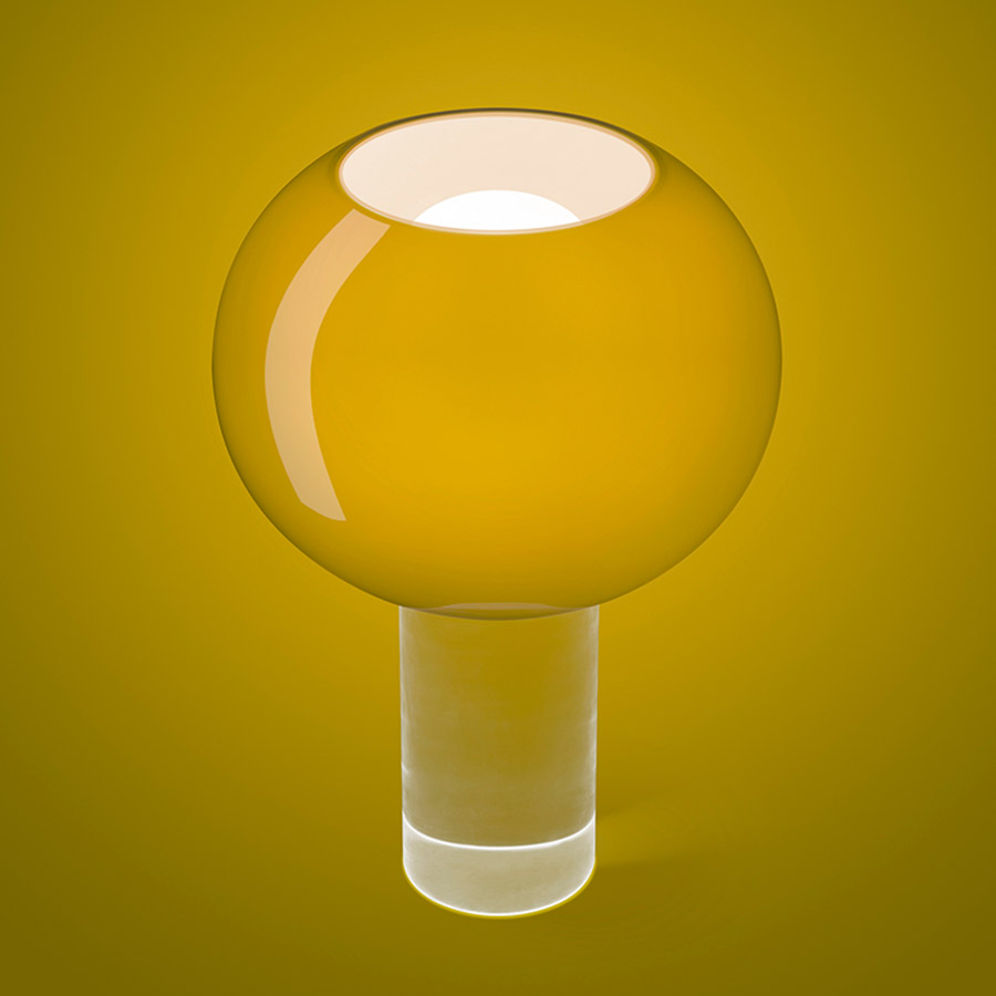 Rodolfo DordoniLámpara de mesa de luz difusa. Difusor de vidrio encamisado con acabado brillante, soplado a boca con cinco capas. Internamente la capa de vidrio en tonalidad «pajiza», amarillo pálido, consigue que la luz sea más cálida y el color más intenso. La versión de color «blanco cálido» resulta de un color marfil cuando está encendida y se queda blanca cuando está apagada.