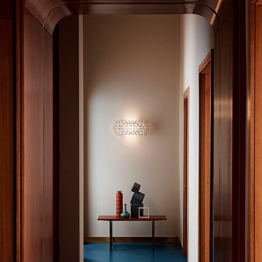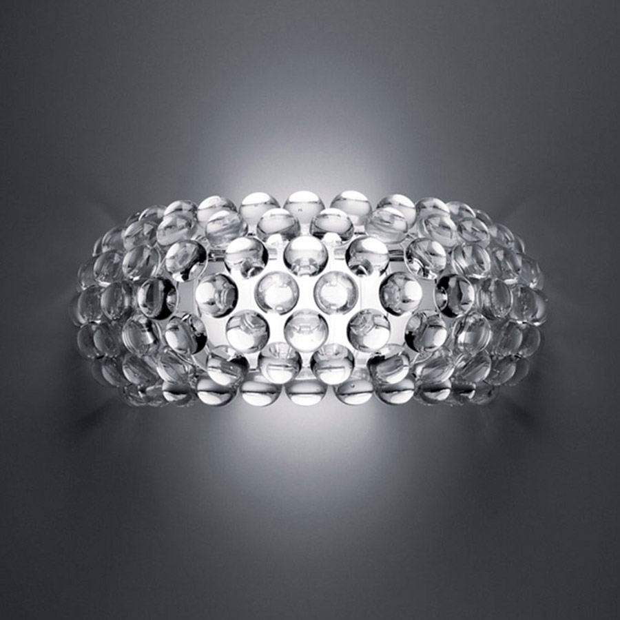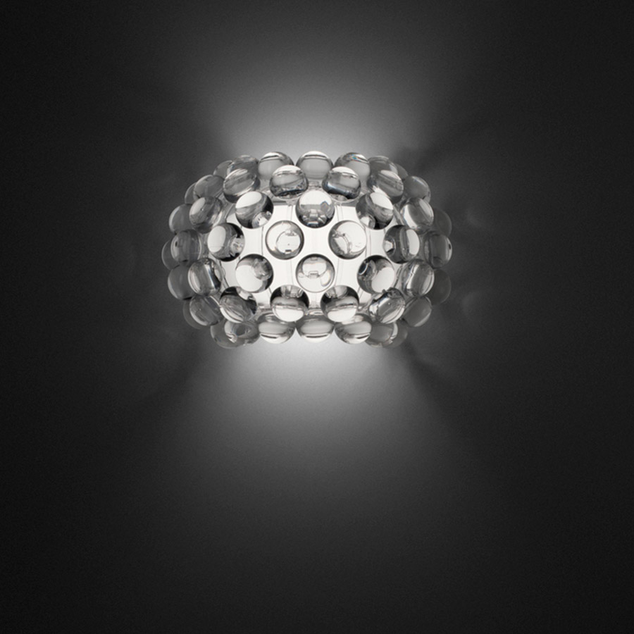 Rica, brillante y sofisticada, la lámpara Caboche es un mosaico de refracciones, una fusión perfecta en una única forma de diversas individualidades que realizan en su conjunto el cuerpo y el efecto luminoso de la lámpara. Cuando está encendida, la luz se propaga desde el interior de las esferas como si se tratara de cristales luminosos, iluminando el ambiente circundante. Caboche de pared es una joya de creatividad y de tecnología que se encuentra disponible en dos medidas y en dos versiones: transparente y amarillo oro. Es adecuada para ambientes privados y públicos, ocupa un lugar de protagonista y combina impacto visual con ligereza, valor decorativo y funcionalidad.