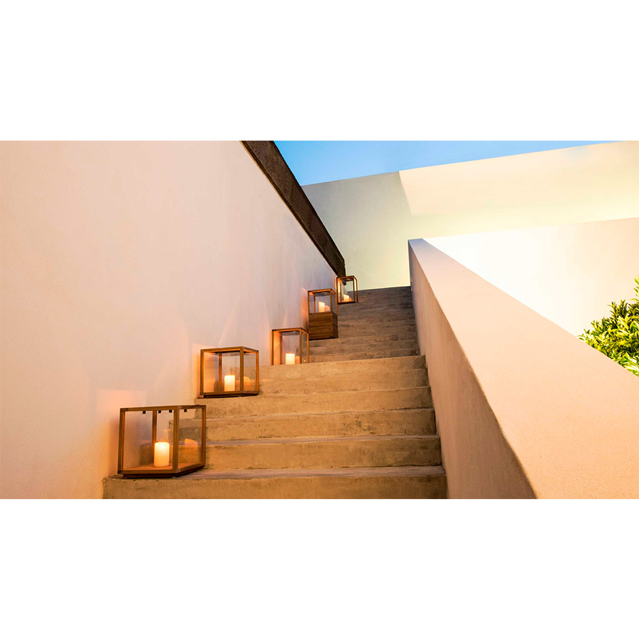 TribuLa terraza se ha convertido en una habitación más de la casa, un lugar para relajarse en un ambiente agradable. Los candelabros de vidrio reforzado térmicamente y su estructura de teca contribuyen con un toque de calidez. Cree un vistoso juego de luces alternando los 2 formatos y colocando en ellos velas de distintas alturas, o combínelos con la base de teca.