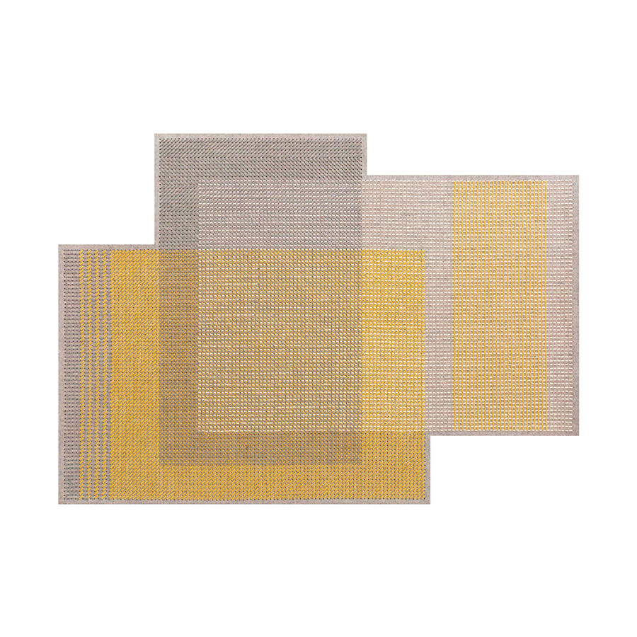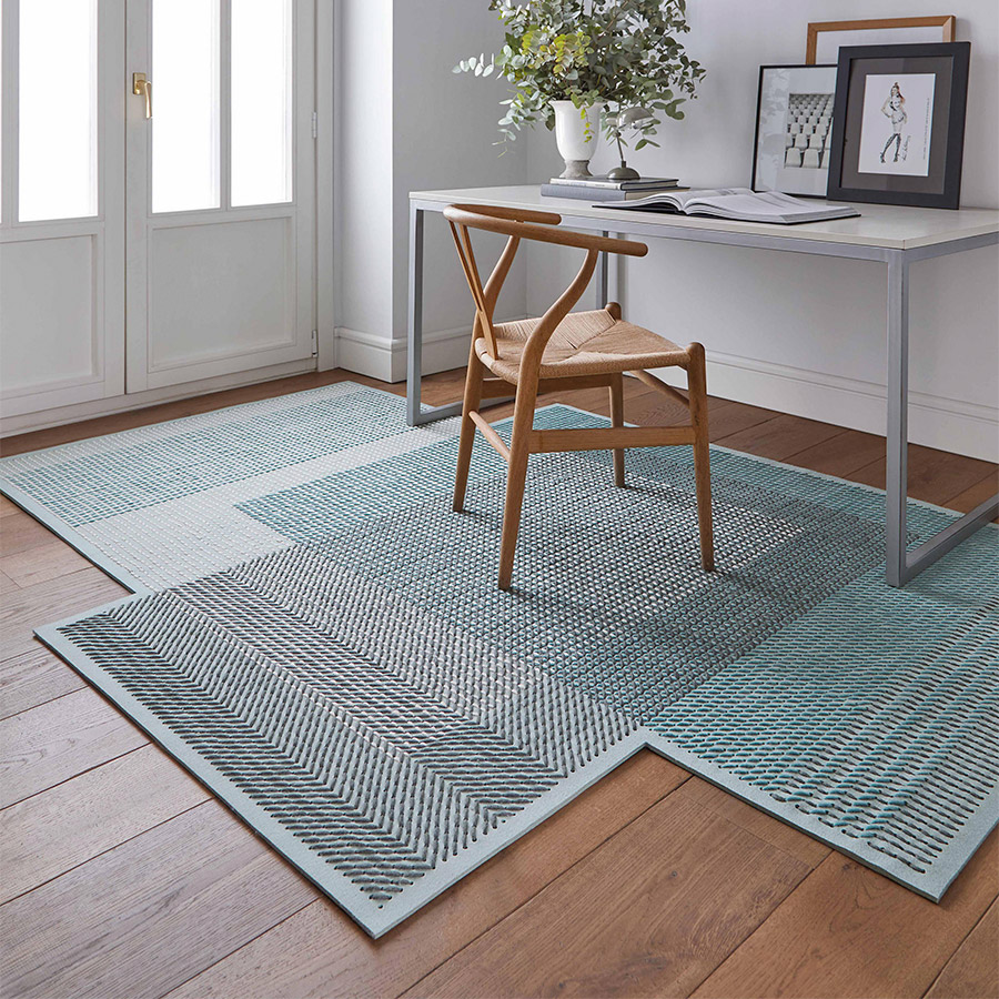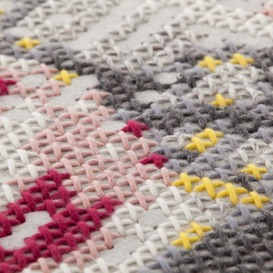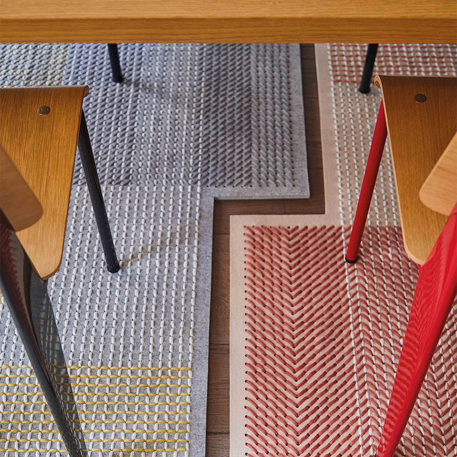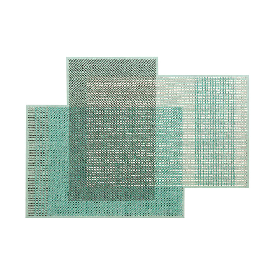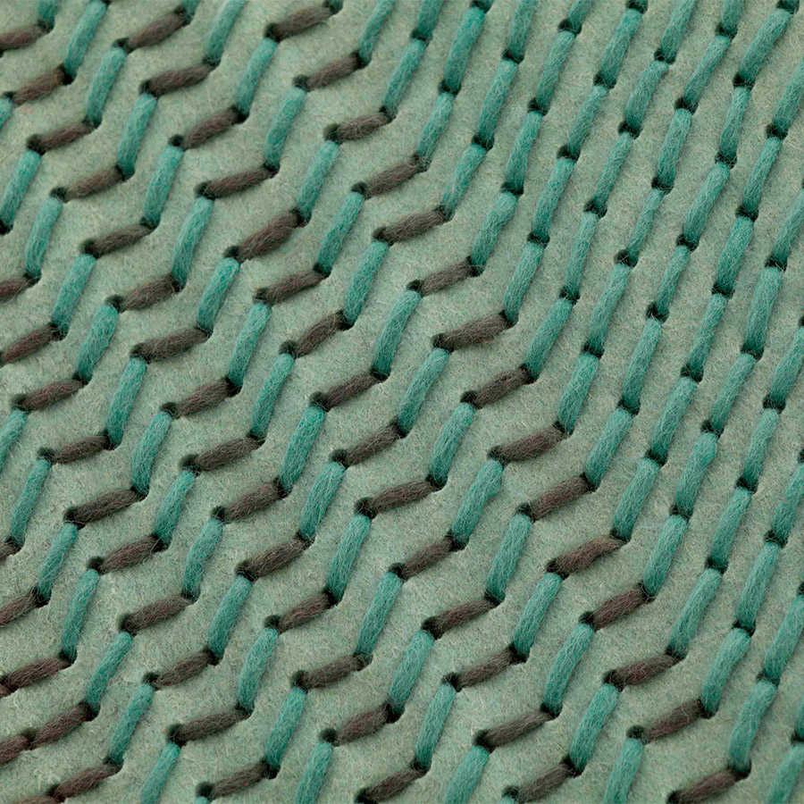 Este es el modelo Green de la colección Canevas Geo, una alfombra con un corte asimétrico y un diseño a base de tramas de color que se superponen. Se elabora a mano sobre una base de fieltro verde claro, bordando puntadas en múltiples direcciones y utilizando lanas de color blanco, verde medio y verde oscuro. Dependiendo de la densidad o de la orientación de las puntadas, las tramas se entremezclan ofreciendo diferentes efectos. Por sus tonos y las distintas densidades que por zonas presenta esta pieza, su estética evoca campos de cultivo vistos desde una perspectiva aérea.