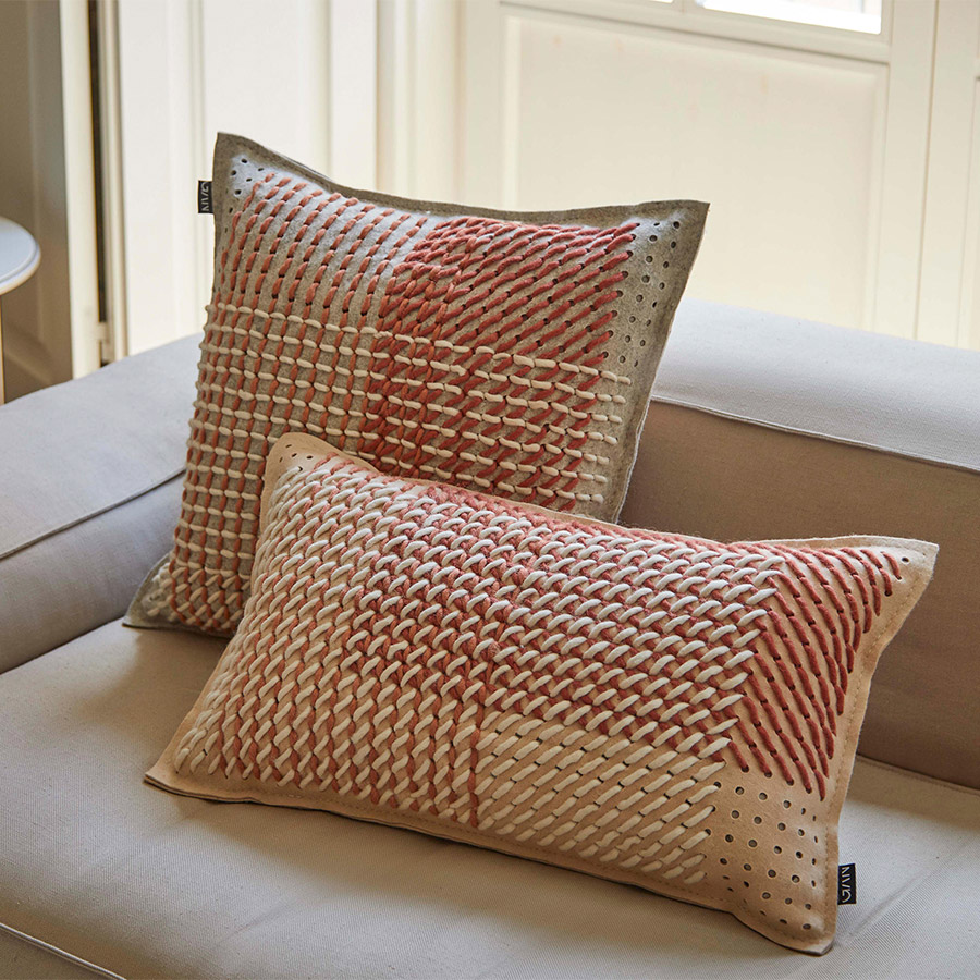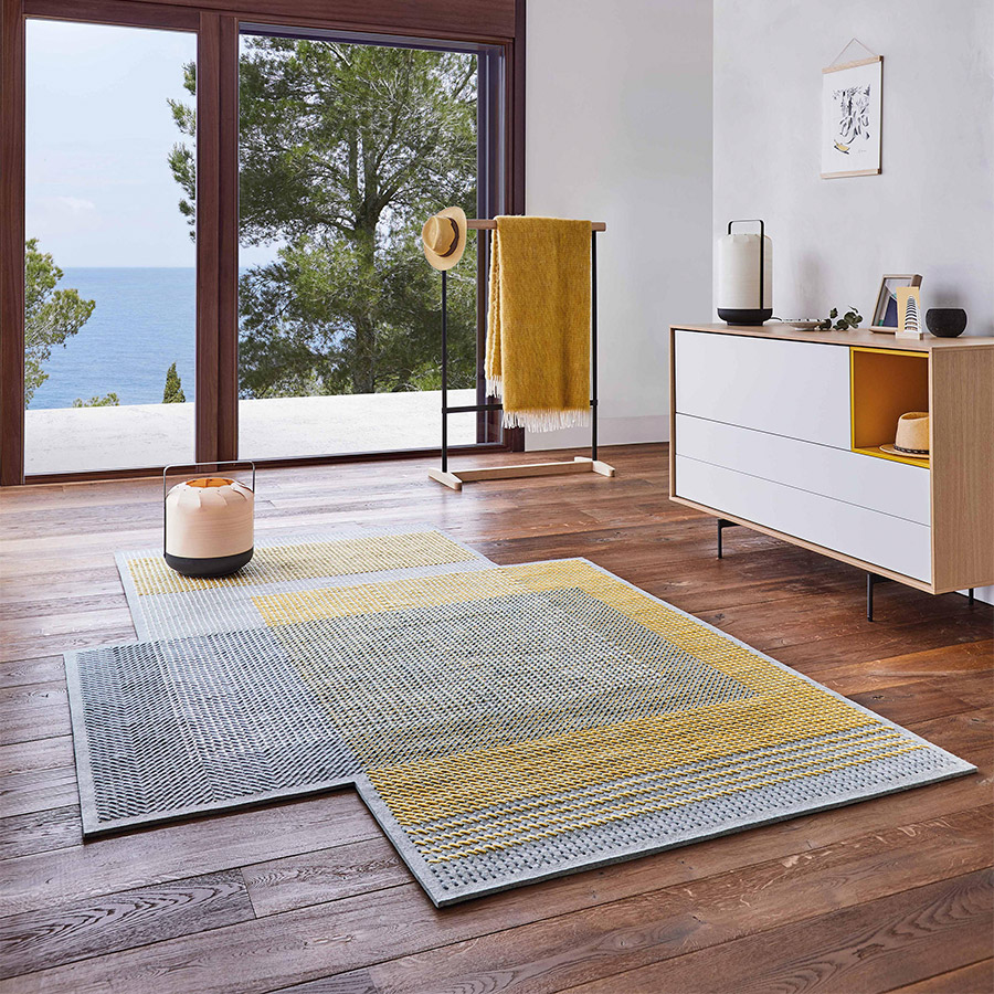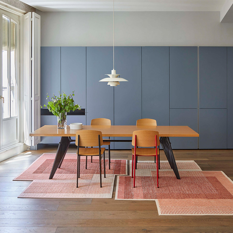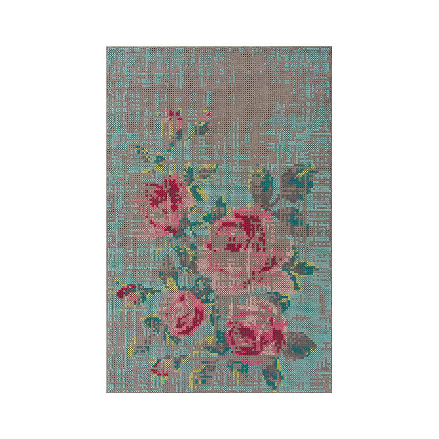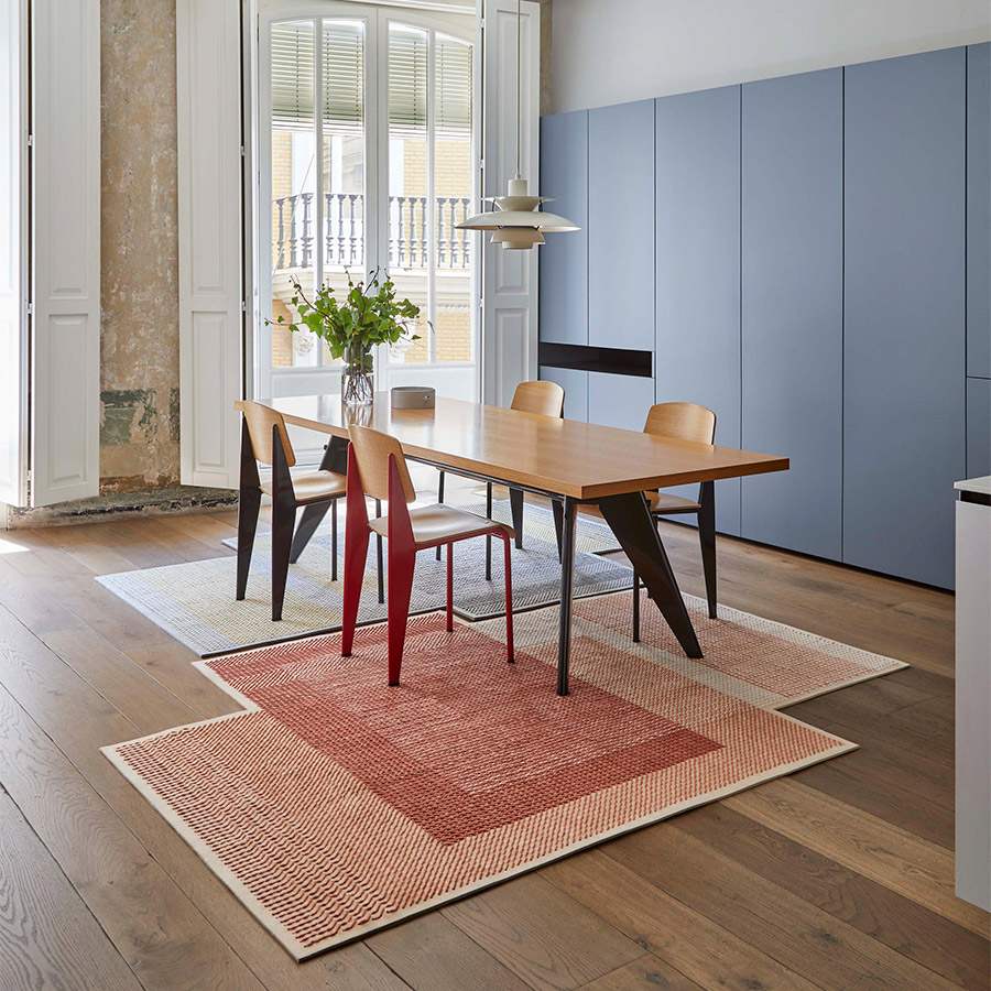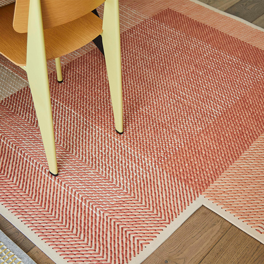 Este es el modelo Green de la colección Canevas Geo, una alfombra con un corte asimétrico y un diseño a base de tramas de color que se superponen. Se elabora a mano sobre una base de fieltro verde claro, bordando puntadas en múltiples direcciones y utilizando lanas de color blanco, verde medio y verde oscuro. Dependiendo de la densidad o de la orientación de las puntadas, las tramas se entremezclan ofreciendo diferentes efectos. Por sus tonos y las distintas densidades que por zonas presenta esta pieza, su estética evoca campos de cultivo vistos desde una perspectiva aérea.