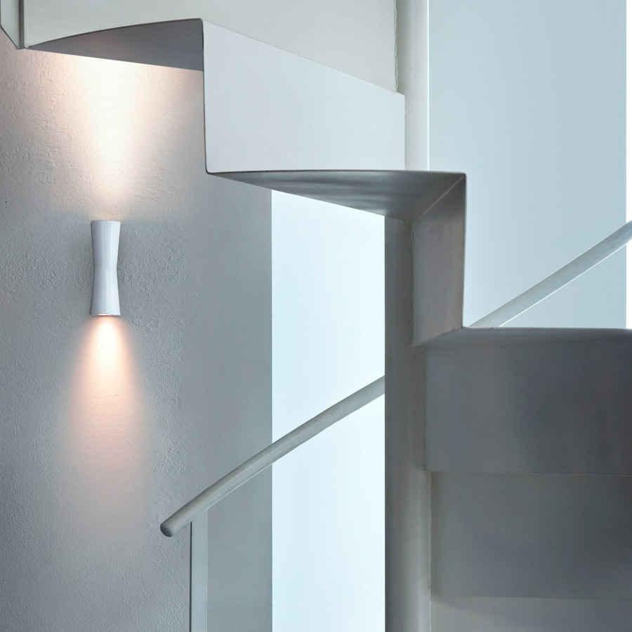 El aplique Clessidra de Flos es un nuevo aplique de pared diseñado por Antonio Citterio que utiliza tecnología LED. Los 20 ° y 40 ° se refieren al ángulo de la luz emitida en la parte superior e inferior. Disponible en blanco y cromo.