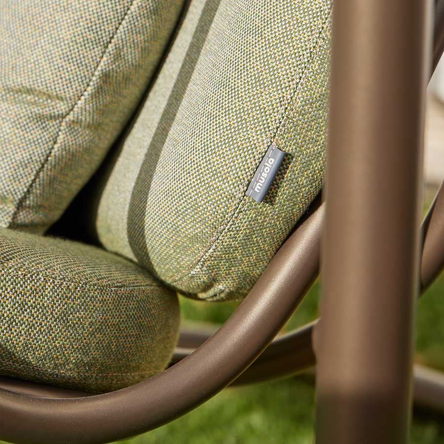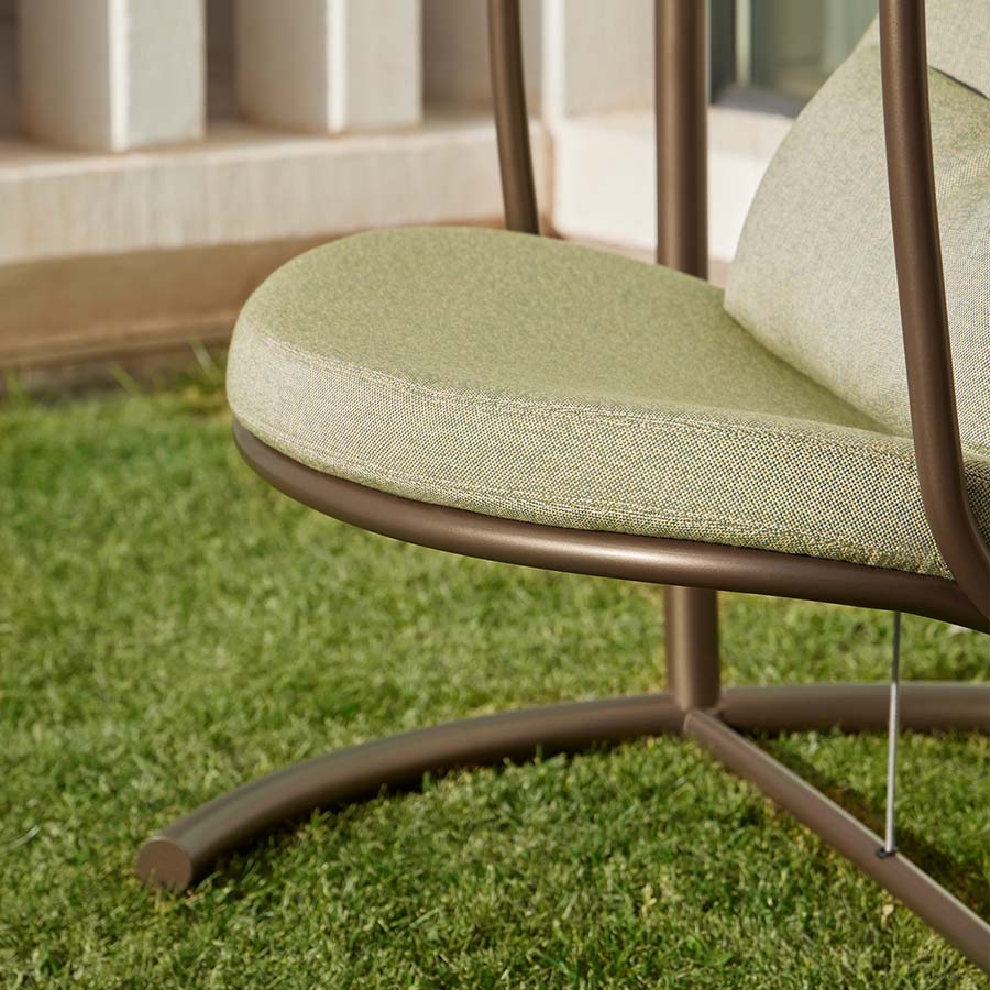 Tomando como referencia este elemento de la naturaleza, Santiago Sevillano se inspiró para crear una pieza única e icónica que encaja con el espíritu fresco y la filosofía mediterránea. Al igual que las aves trenzan ramas, el tubo de acero inoxidable se entrelaza para formar la estructura liviana y orgánica del columpio, sirviendo de soporte al asiento y al respaldo tapizado de formas cóncavas que aportan comodidad y ligereza visual.