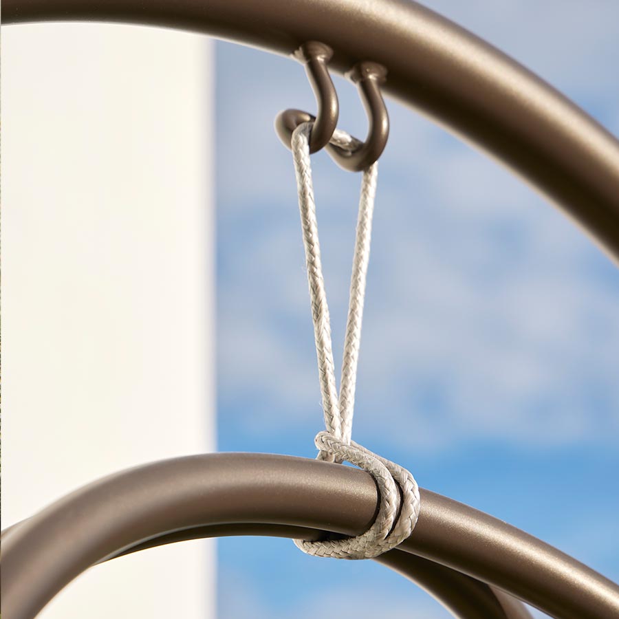 El columpio puede colgarse de cualquier soporte fijo o del soporte diseñado específicamente: una estructura en forma de parábola que lo enmarca y lo resalta, y que nos permite disfrutar del relajante movimiento de esta pieza tan mediterránea.