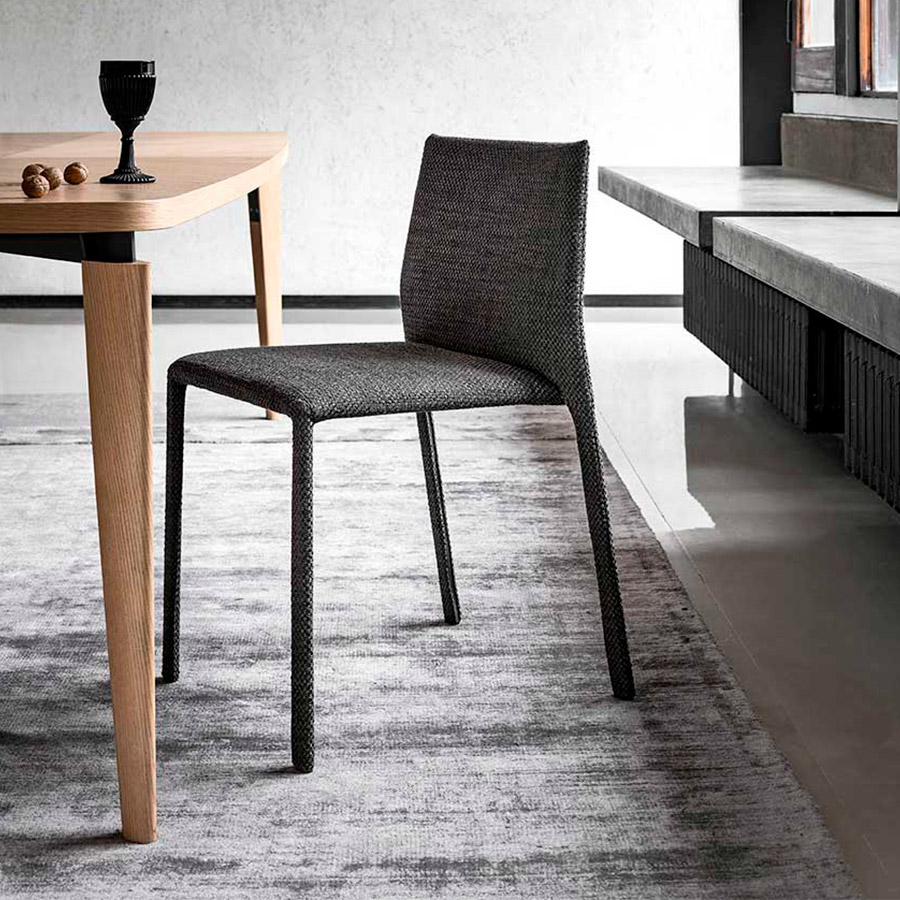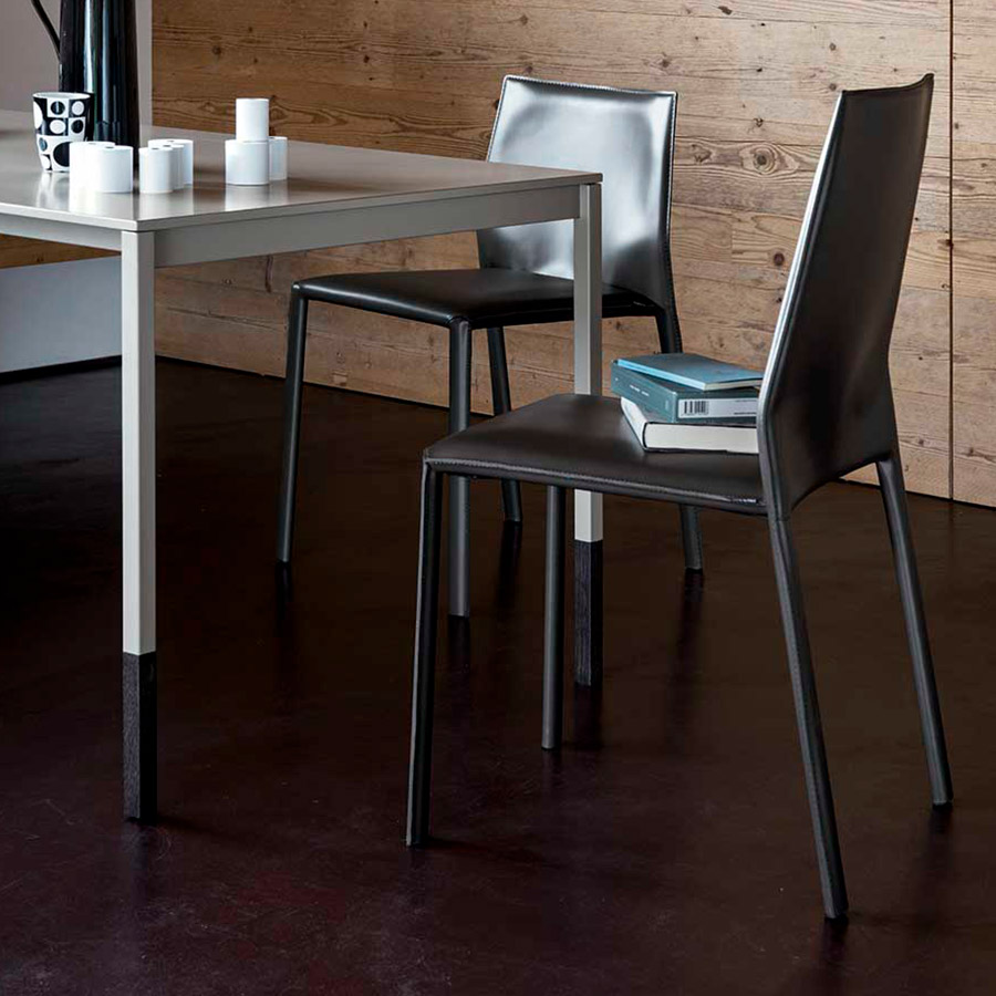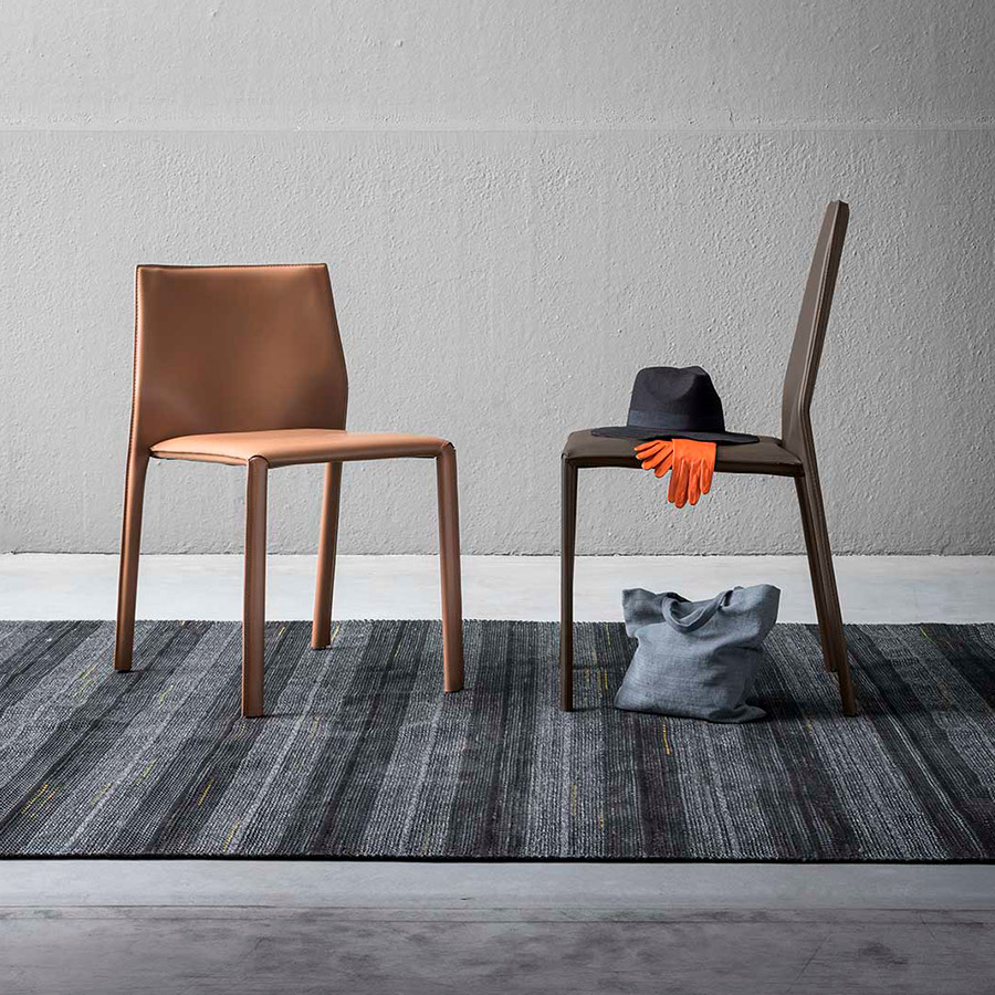 R.D.A.Corium es una silla con una forma muy contenida, disponible con una cubierta de cuero, tela, cuero y cuero ecológico y con un respaldo de 93 cm de alto o más bajo, 80 cm.