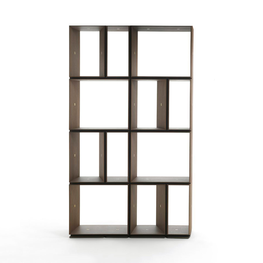 G. CarolloEstantería modular compuesta da dos contenedores de 32 cm y de 60 cm. Los contenedores en la base tienen contrapesos de metal. Encima de los elementos de la base se montan los diferentes contenedores, que se unen a través de junturas de latón cepillado curvado.