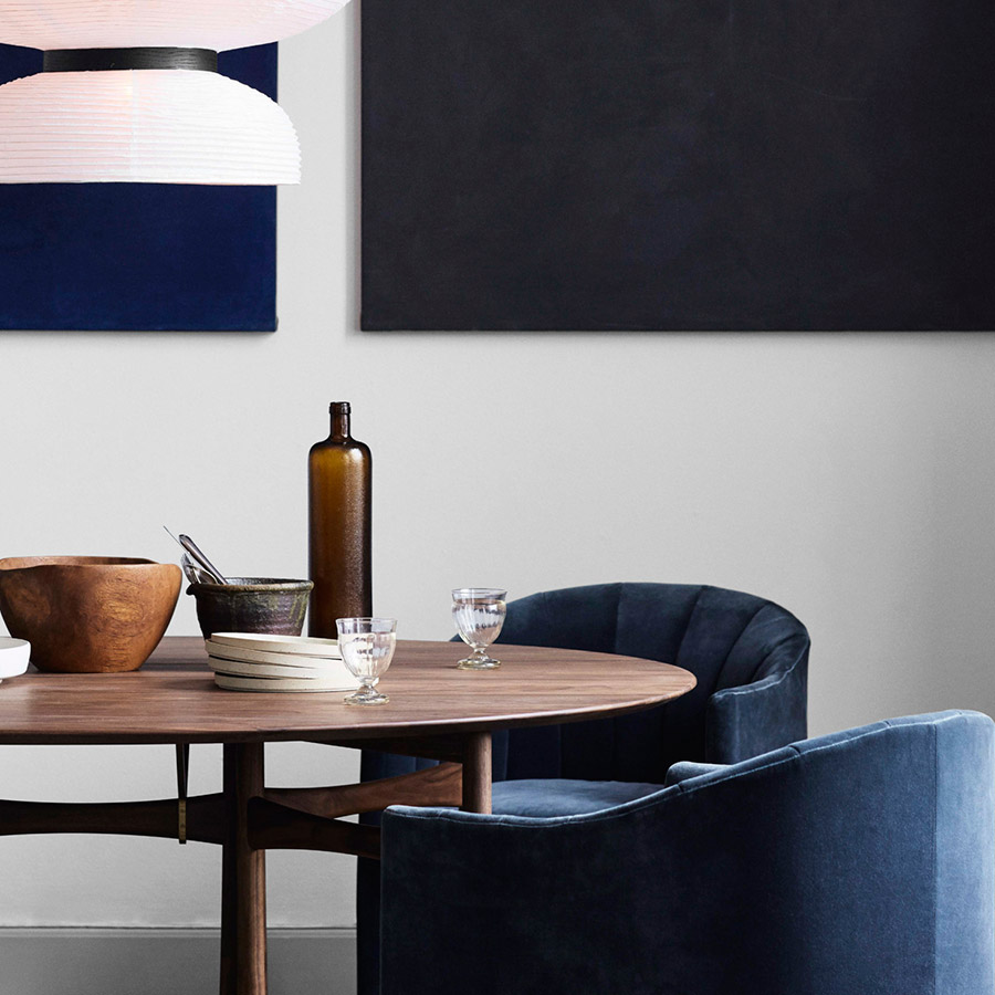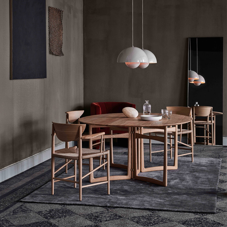 Buscando crear una pieza versátil que se adaptara a su entorno, el dúo de diseño Hvidt & Mølgaard ideó Drop Leaf en 1956. Como su nombre indica, esta hermosa mesa fue construida con una encimera con bisagras en cada lado que se pliega desde el centro fijo. Disponible en nogal macizo o roble.
