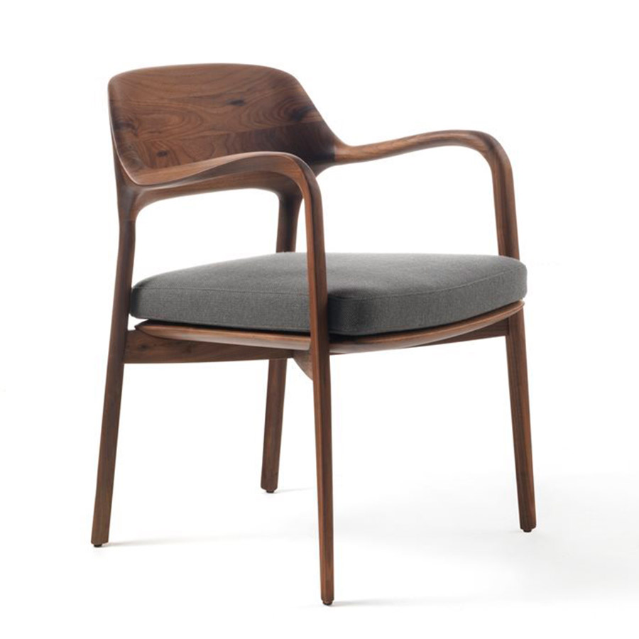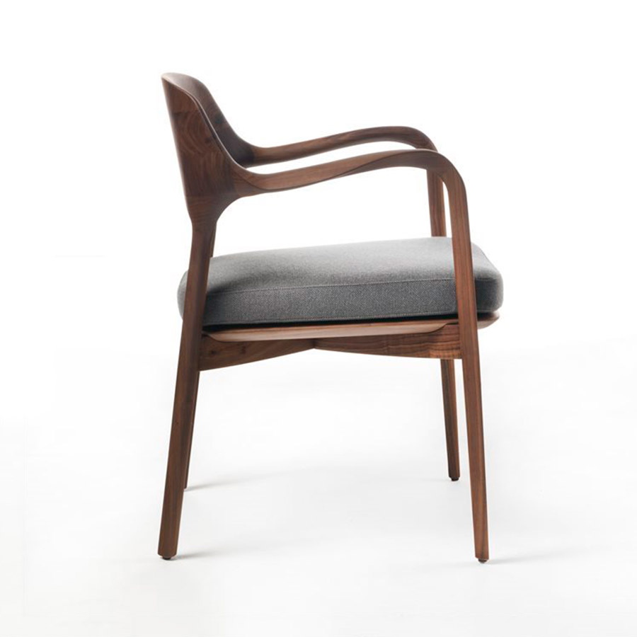 P. JouinSilla con brazos y estructura de nogal canaletta macizo. Asiento de nogal canaletta maciazo con relleno en goma de densidad diferenciada con soporte interno de contrachapado revestido en las telas de la colección. Con pies de nylon.