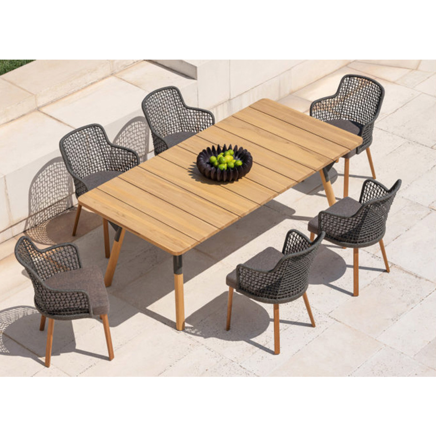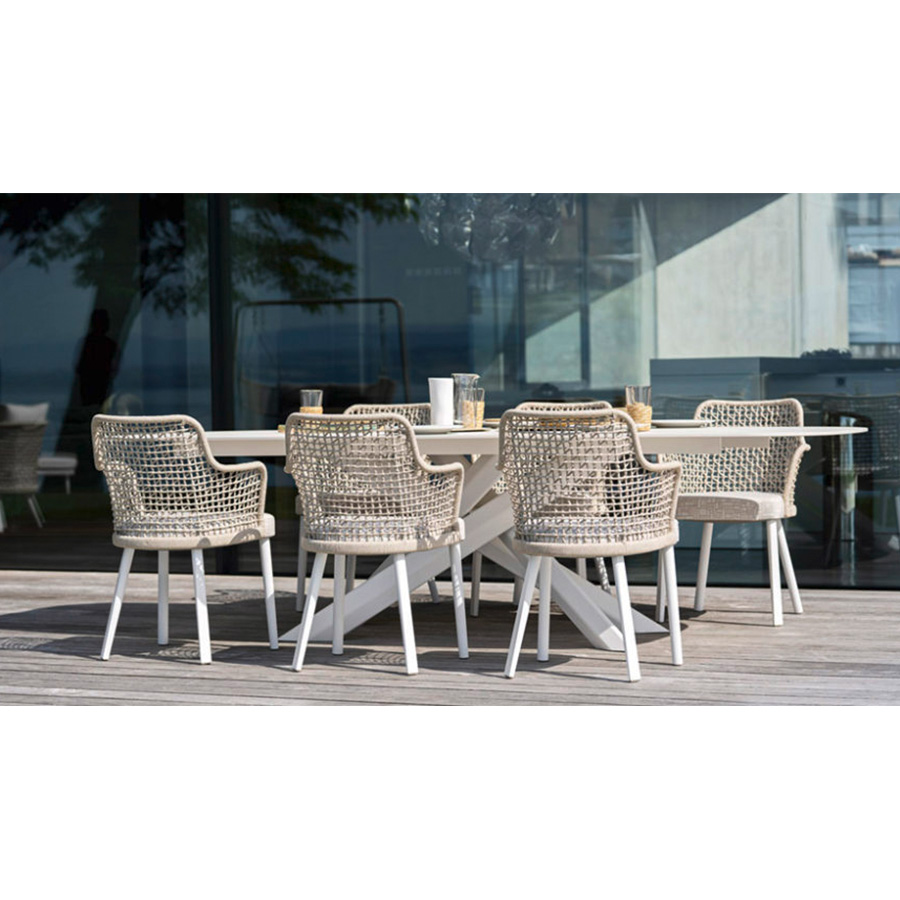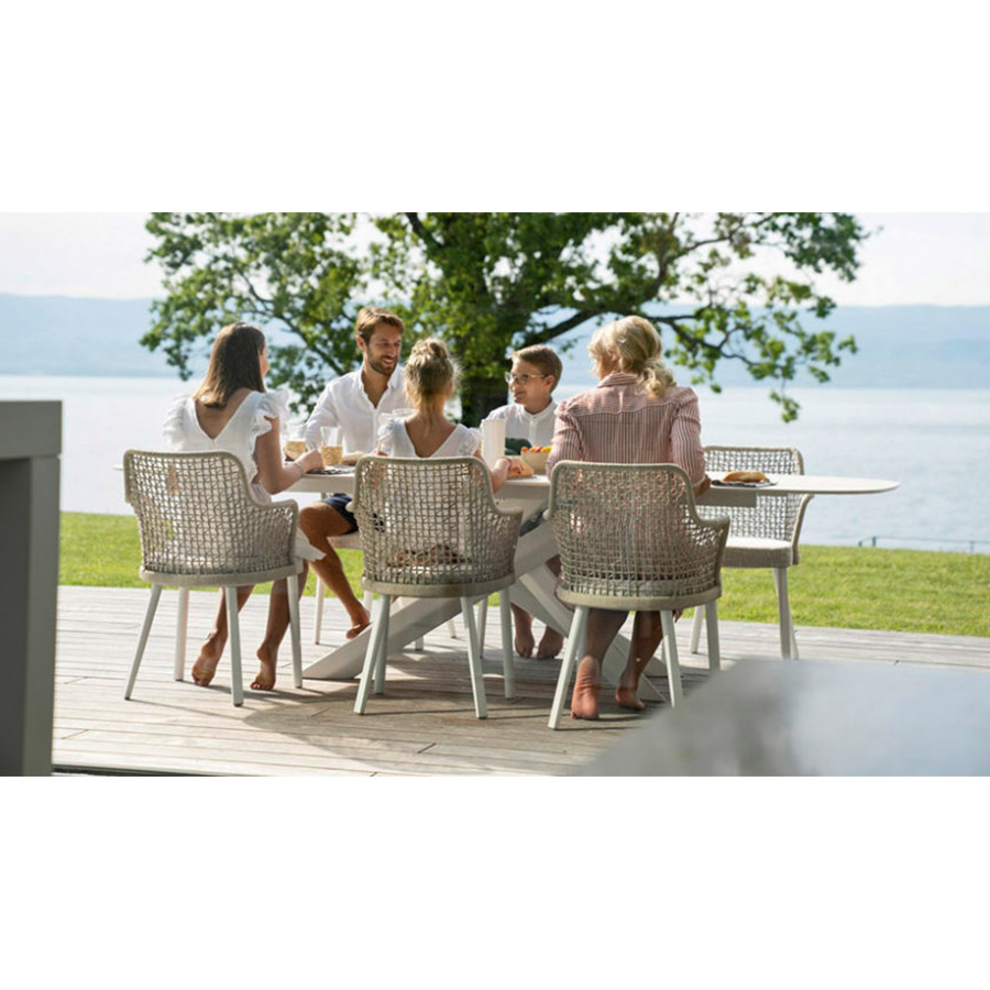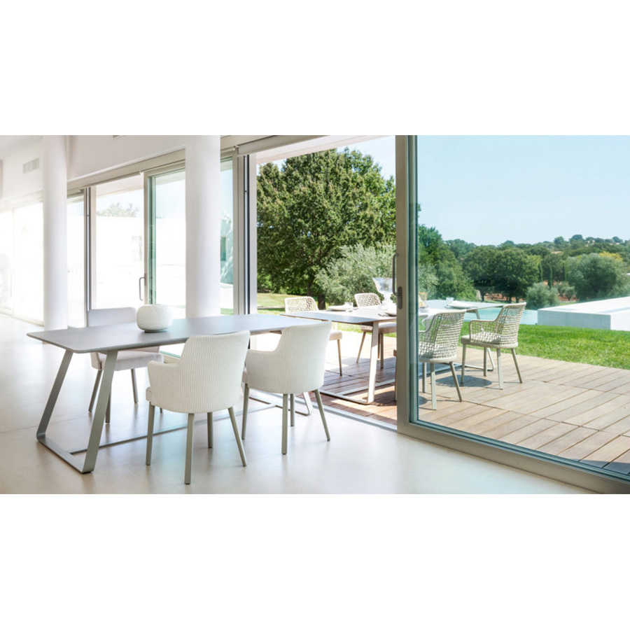 Es posible elegir entre patas de aluminio de varios colores o en madera maciza de iroko. El asiento del sillón de exterior Emma está acolchado y puede forrarse con tela o Textilene, mientras que los respaldos tienen una estructura de aluminio con recubrimiento de polvo cubierto con cordón tejido a mano o Textilene. El sillón para exteriores Emma nació para uso en exteriores en entornos privados o contract. Este objeto de diseño moderno también es altamente funcional y tiene un estilo femenino y elegante.